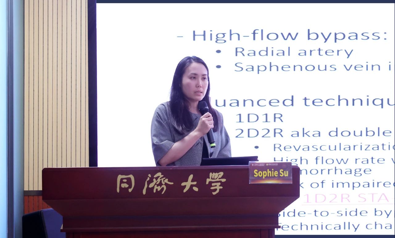 Sophie Su博士作“煙霧病的迷障”學術報告,她詳細介紹了煙霧病概述、治療目標、手術方案選擇依據(jù)、療效與隨訪等,并重點介紹了直接搭橋、間接搭橋、聯(lián)合搭橋等多種搭橋手術技術的可行性、技術細節(jié)、臨床應用及其優(yōu)缺點等,提升了大家對煙霧病的認識,拓展了臨床診療思路。