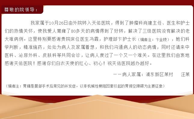 汪老師還介紹,他了解到術(shù)后胃癱綜合征持續(xù)時(shí)間越長(zhǎng),對(duì)人的傷害就越大,因此愛人的病情常常讓他擔(dān)驚受怕。如今看著愛人的病情一天天好轉(zhuǎn),醫(yī)療費(fèi)用也逐漸下降,不僅很大程度上減輕了醫(yī)療費(fèi)用負(fù)擔(dān),也讓他更加深切地感受到天佑醫(yī)院醫(yī)護(hù)人員全心全意為患者著想的真心。