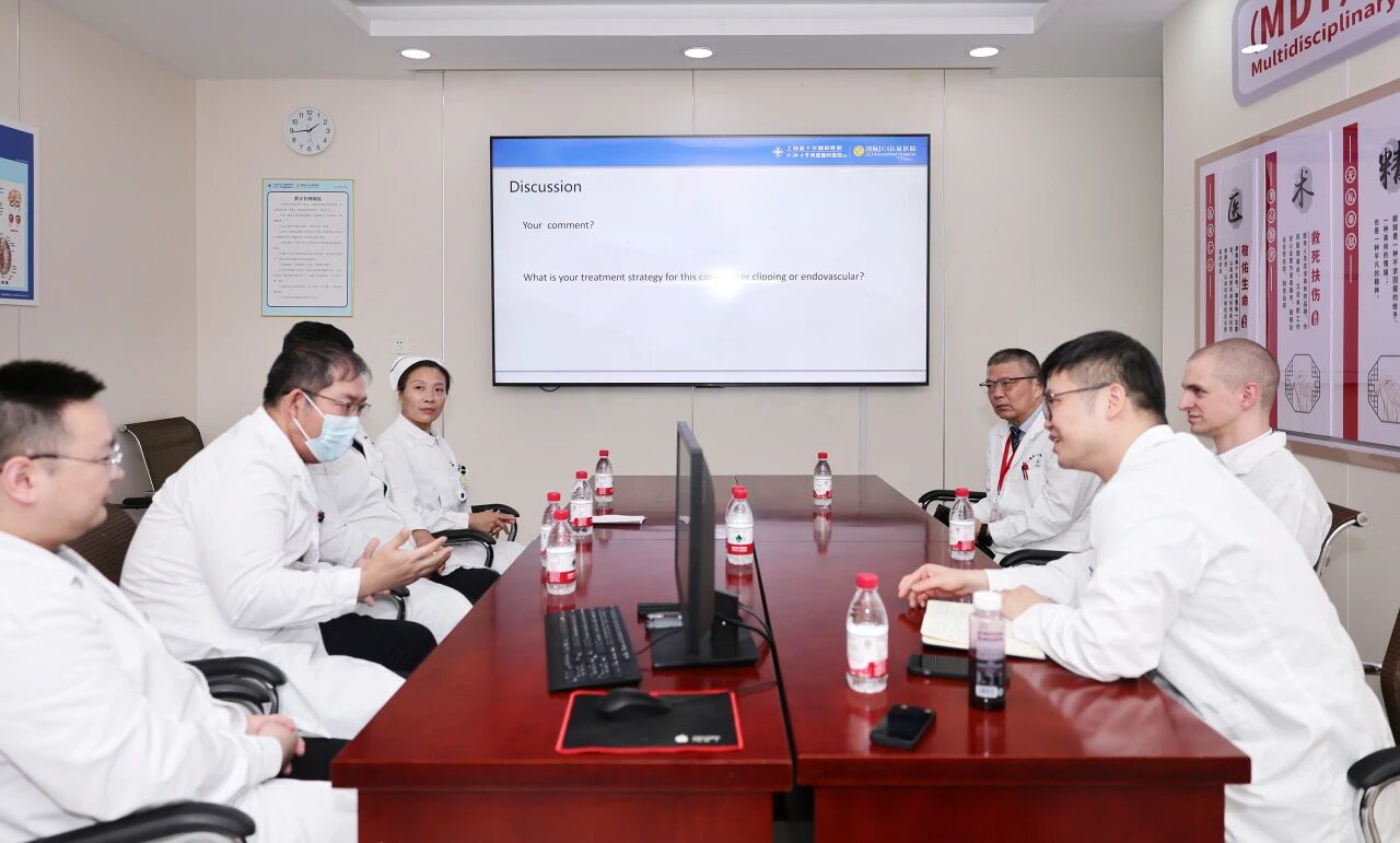 在周克祥副院長陪同下,David Satzer博士與6B神經(jīng)外二科盧云鶴博士團隊開展病例討論。盧云鶴博士以流利英文主持,雙方就大腦中動脈分叉部動脈瘤的治療策略進行交流。David Satzer博士介紹了美國基于指南的外科手術主流方式,并對上海藍十字腦科醫(yī)院開展的血流導向裝置、WEB擾流裝置等介入技術表示肯定。此外,雙方還就腦轉移瘤綜合治療、強迫癥外科手術的倫理法律差異等議題展開探討。盧云鶴博士重點介紹了醫(yī)院在腦機接口領域的臨床應用,特別是對昏迷患者進行意識評估及脊髓電刺激促醒的實踐成果,引起David Satzer博士濃厚興趣。雙方討論持續(xù)兩個半小時,意猶未盡,并互換聯(lián)系方式,期待在學科建設與科研合作方面持續(xù)推進。