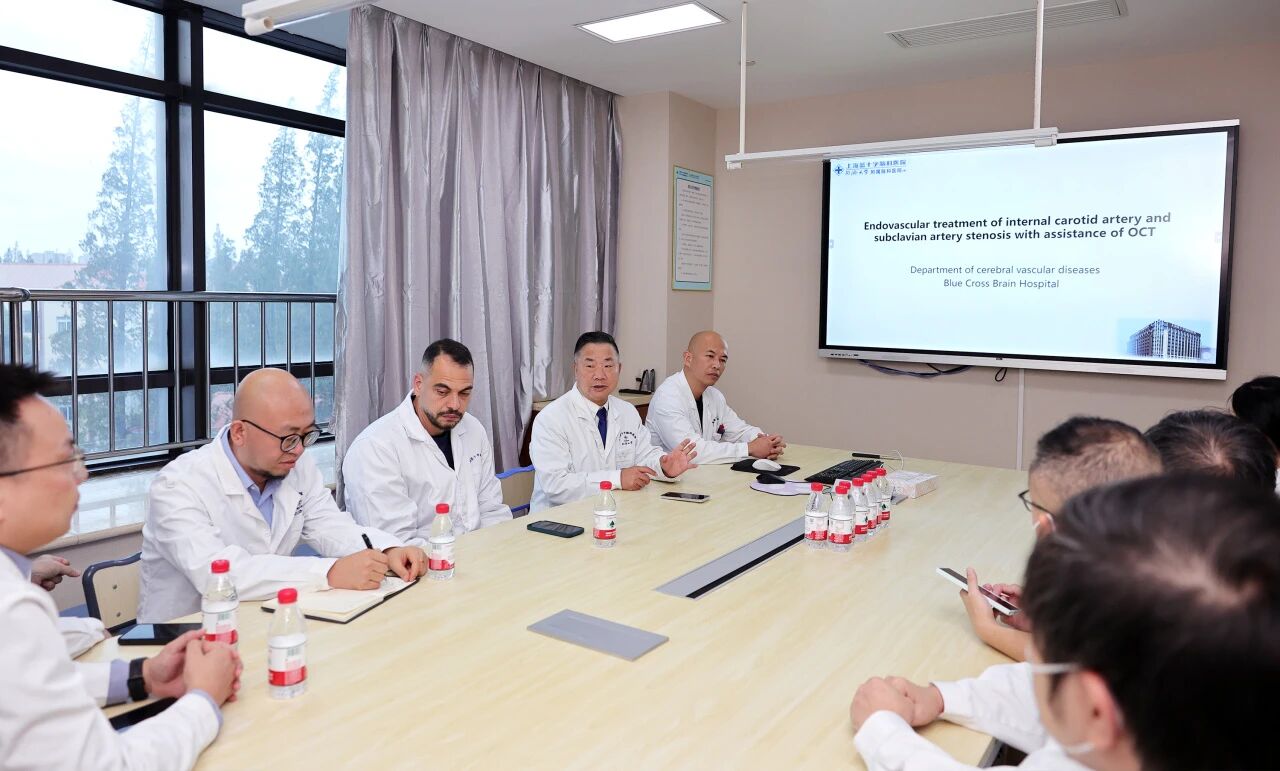 Tareq Kass-Hout副教授在潘耀良副院長陪同下,深入4F腦血管病科,圍繞一例復雜的“頸內(nèi)動脈合并鎖骨下動脈狹窄”病例,與科室團隊進行了深入討論。雙方重點探討了OCT(光學相干斷層成像)這一前沿血管內(nèi)影像技術在術前評估、術中支架選型與放置、以及術后效果評價中的關鍵作用。Tareq Kass-Hout副教授對上海藍十字腦科醫(yī)院能夠熟練運用OCT技術處理復雜病變表示贊賞,并結合該病例與與席剛明教授、王貴平博士團隊就抗血小板治療策略調(diào)整、栓塞保護方案優(yōu)化、不同介入路徑(如橈動脈)的器械選擇等臨床難點展開交流。這場基于真實病例的深度對話,超越技術展示層面,直擊臨床決策核心,充分體現(xiàn)雙方合作的務實與高效,也為未來在腦血管介入領域的聯(lián)合研究與技術提升開辟了新路徑。