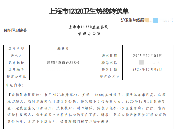 12月2日,上海天佑醫(yī)院收到了一份特殊的禮物——來自“上海市12320衛(wèi)生熱線”轉(zhuǎn)發(fā)來的患者表揚(yáng)信。73歲的患者通過“熱線”表達(dá)了對(duì)我院醫(yī)學(xué)影像團(tuán)隊(duì)的感謝。