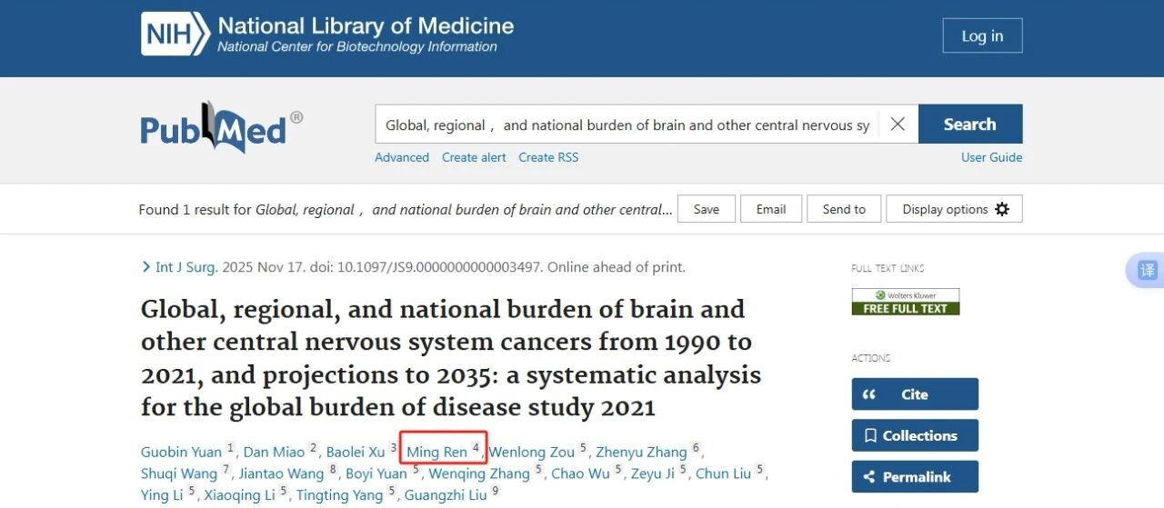 上海藍(lán)十字腦科醫(yī)院學(xué)術(shù)研究工作持續(xù)精進(jìn),學(xué)科建設(shè)成果斐然。近日,醫(yī)院神經(jīng)內(nèi)科任明博士為核心成員參與完成的,以腦部和其他中樞神經(jīng)系統(tǒng)癌癥負(fù)擔(dān)及預(yù)測(cè)為主題的研究論文在國(guó)際知名期刊《International Journal of Surgery》發(fā)表,并被SCI收錄,該期刊最新影響因子高達(dá)13。