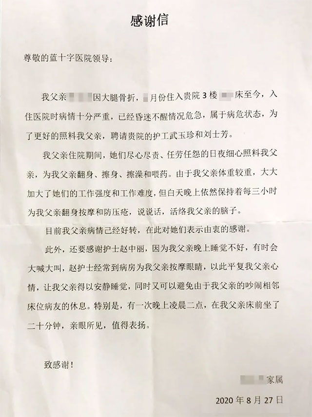 我父親住院期間,她們盡心盡責(zé)、任勞任怨的(地)日夜細(xì)心照顧我父親,為我父親翻身、擦身、擦澡。由于我父親體重較重,大大加大了她們的工作強(qiáng)度和工作難度,但白天晚上毅然保持著每三小時(shí)為我父親翻身按摩和防壓瘡,說說話,活絡(luò)我父親的腦子。
