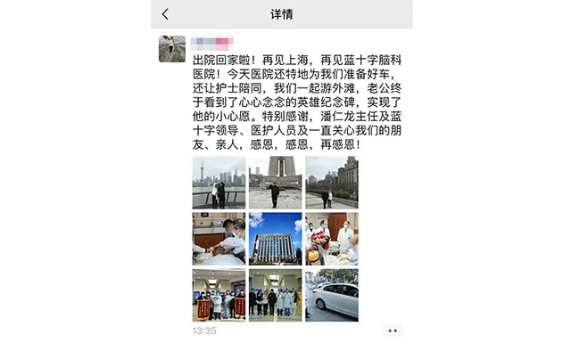 小莫夫婦及家屬對潘主任及藍十字醫(yī)護人員的全力救治由衷地表示感謝。妻子馮凰芬說,小莫當時病情危急,只要一絲希望她也絕不會放棄,當他被轉(zhuǎn)院到上海藍十腦科醫(yī)院,眼見丈夫病情一天天好轉(zhuǎn),最終恢復常態(tài),完完整整地出院回家,“這多虧潘主任及醫(yī)護人員辛勤付出!”小馮有點哽咽了。