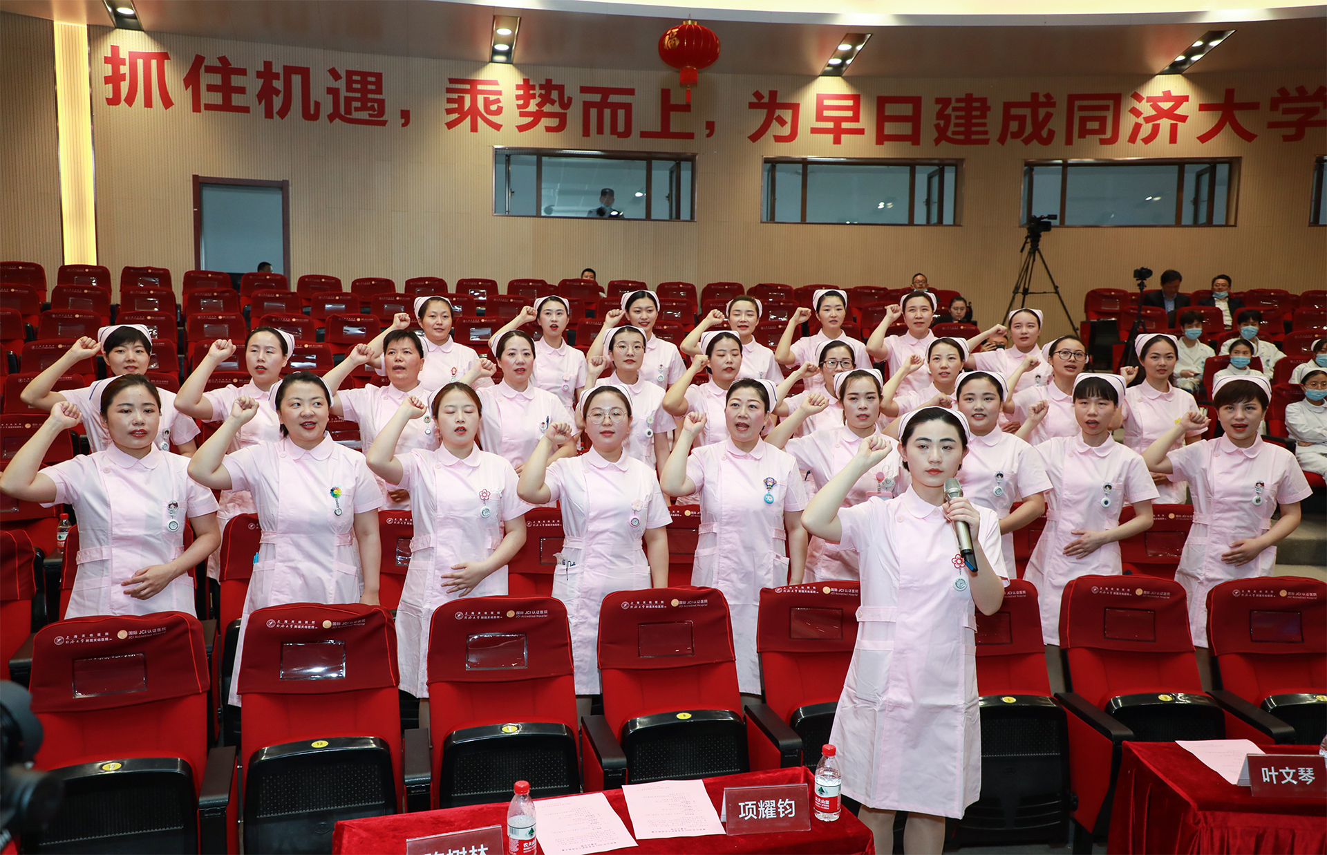27名參賽選手集體誦讀比賽誓詞,上海藍(lán)生萬眾醫(yī)院六病區(qū)護(hù)士長時辰領(lǐng)誓。全體參賽選手精神飽滿,聲音鏗鏘,展現(xiàn)了良好的精神風(fēng)貌和必勝的決心意志。