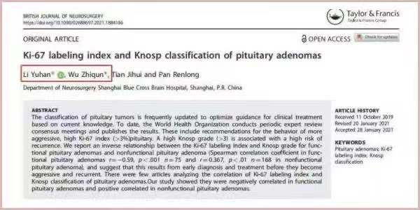 吳治群博士還以共一作者身份在影響因子為1.29的《英國(guó)神經(jīng)外科雜志》發(fā)表題為“Ki-67 labeling index and Knosp classification of pituitary adenomas”(中文:垂體腺瘤Ki-67標(biāo)記指數(shù)和Knosp分類)的論文。