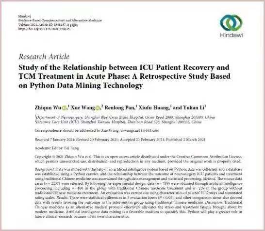 近日,公司旗下上海藍(lán)十字腦科醫(yī)院神經(jīng)外科6B病區(qū)副主任吳治群博士以第一作者身份在影響因子為1.843的《循環(huán)補(bǔ)充和替代醫(yī)學(xué)》期刊發(fā)表題為“Study of the Relationship between ICU Patient Recovery and TCM Treatment in Acute Phase:A Retrospective Study Based on Python Data Mining Technology”(中文:基于Python數(shù)據(jù)挖掘技術(shù)的ICU患者急性期康復(fù)與中醫(yī)治療關(guān)系的回顧性研究)的研究論著。