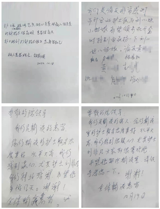 “我們是輸液室的(患者),你們輸液室的護(hù)士服務(wù)態(tài)度真好,水平又高,我們感到很暖心(溫心)......”