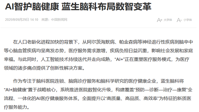 中新網(wǎng):AI智護(hù)腦健康 藍(lán)生腦科布局?jǐn)?shù)智變革