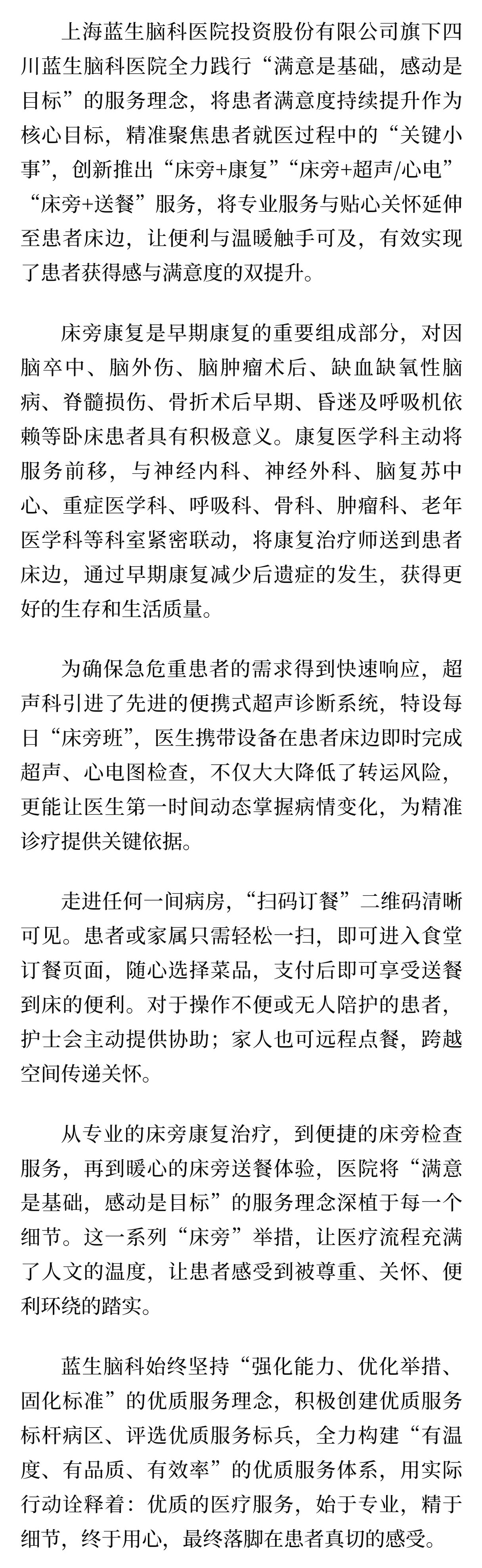 上海藍生腦科醫(yī)院投資股份有限公司旗下四川藍生腦科醫(yī)院全力踐行“滿意是基礎(chǔ),感動是目標”的服務(wù)理念,將患者滿意度持續(xù)提升作為核心目標,精準聚焦患者就醫(yī)過程中的“關(guān)鍵小事”,創(chuàng)新推出“床旁+康復(fù)”“床旁+超聲/心電”“床旁+送餐”服務(wù),將專業(yè)服務(wù)與貼心關(guān)懷延伸至患者床邊,讓便利與溫暖觸手可及,有效實現(xiàn)了患者獲得感與滿意度的雙提升。