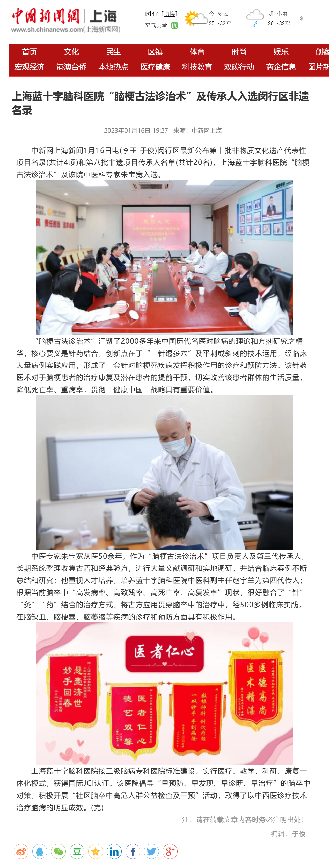中新網(wǎng)上海新聞1月16日電(李玉 于俊)閔行區(qū)最新公布第十批非物質(zhì)文化遺產(chǎn)代表性項(xiàng)目名錄(共計(jì)4項(xiàng))和第八批非遺項(xiàng)目傳承人名單(共計(jì)20名),上海藍(lán)十字腦科醫(yī)院“腦梗古法診治術(shù)”及該院中醫(yī)科專家朱寶寬入選。