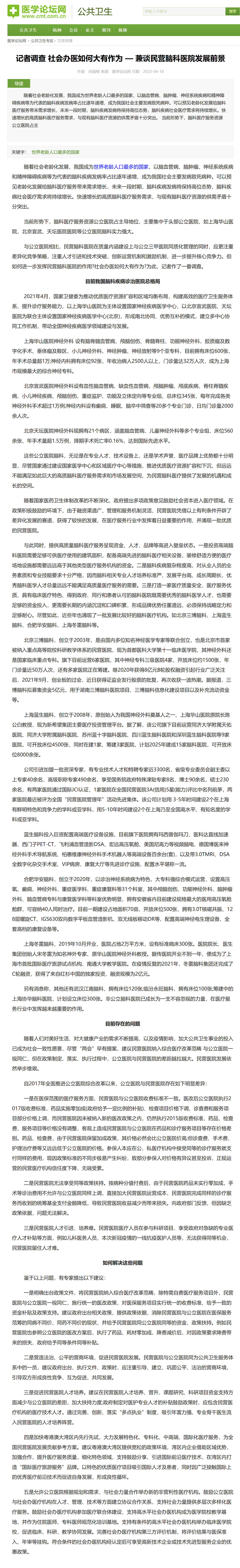 隨著社會老齡化發(fā)展,我國成為世界老齡人口最多的國家,以腦血管病、腦腫瘤、神經(jīng)系統(tǒng)疾病和精神障礙疾病等為代表的腦科疾病發(fā)病率占比逐年遞增,成為我國社會主要發(fā)病致死病種。可以預(yù)見老齡化發(fā)展給腦科醫(yī)療服務(wù)帶來需求增長,未來一段時期,腦科疾病發(fā)病將保持高位態(tài)勢,腦科疾病社會醫(yī)療需求將持續(xù)增長。快速增長的高質(zhì)腦科醫(yī)療服務(wù)需求,與現(xiàn)有腦科醫(yī)療資源的供需矛盾十分突出。