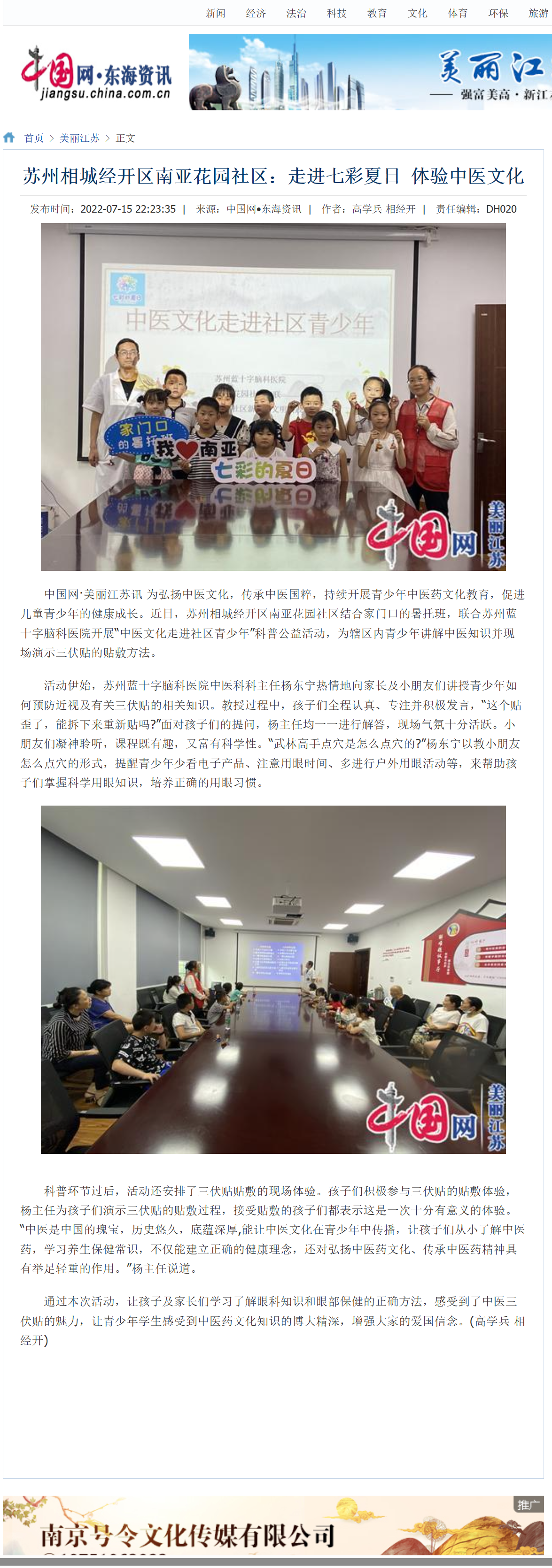 中國(guó)網(wǎng)·美麗江蘇訊 為弘揚(yáng)中醫(yī)文化,傳承中醫(yī)國(guó)粹,持續(xù)開展青少年中醫(yī)藥文化教育,促進(jìn)兒童青少年的健康成長(zhǎng)。近日,蘇州相城經(jīng)開區(qū)南亞花園社區(qū)結(jié)合家門口的暑托班,聯(lián)合蘇州藍(lán)十字腦科醫(yī)院開展“中醫(yī)文化走進(jìn)社區(qū)青少年”科普公益活動(dòng),為轄區(qū)內(nèi)青少年講解中醫(yī)知識(shí)并現(xiàn)場(chǎng)演示三伏貼的貼敷方法。