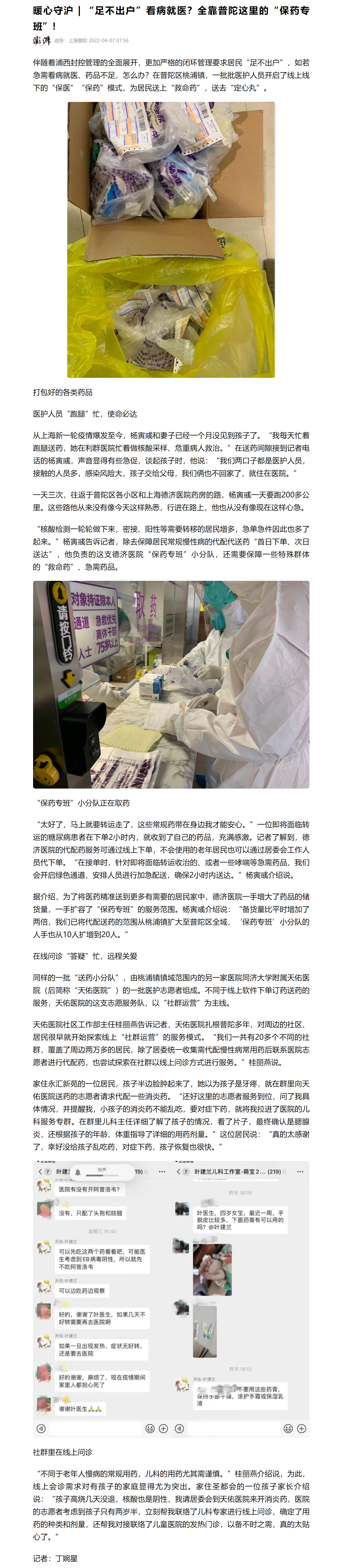 同樣的一批“送藥小分隊”,由桃浦鎮(zhèn)鎮(zhèn)域范圍內的另一家醫(yī)院同濟大學附屬天佑醫(yī)院(后簡稱“天佑醫(yī)院”)的一批醫(yī)護志愿者組成。不同于線上軟件下單訂藥送藥的服務,天佑醫(yī)院的這支志愿服務隊,以“社群運營”為主線。