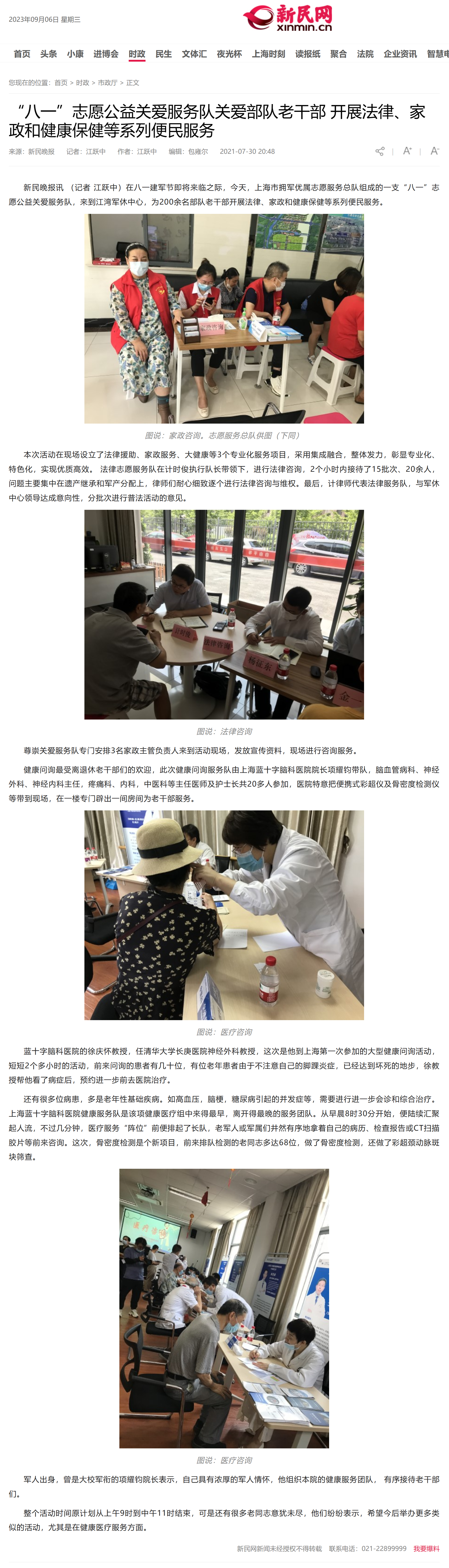 新民晚報訊 (記者 江躍中)在八一建軍節(jié)即將來臨之際,今天,上海市擁軍優(yōu)屬志愿服務(wù)總隊組成的一支“八一”志愿公益關(guān)愛服務(wù)隊,來到江灣軍休中心,為200余名部隊老干部開展法律、家政和健康保健等系列便民服務(wù)。