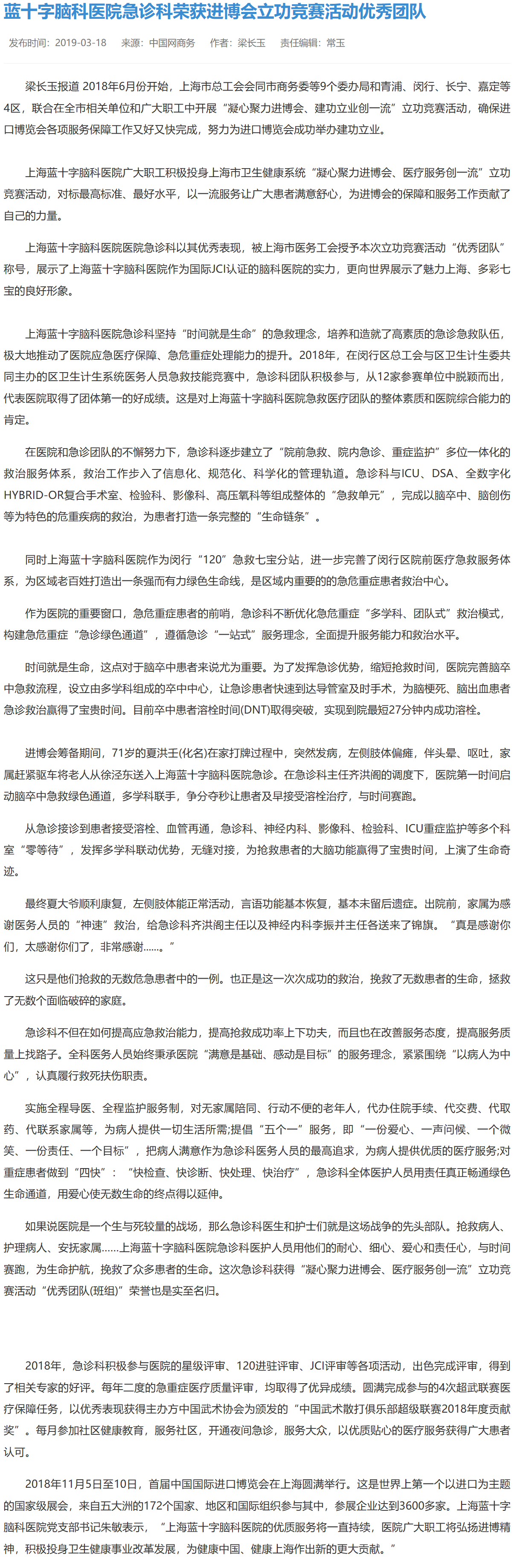 中國網(wǎng)商務(wù):藍十字腦科醫(yī)院急診科榮獲進博會立功競賽活動優(yōu)秀團隊