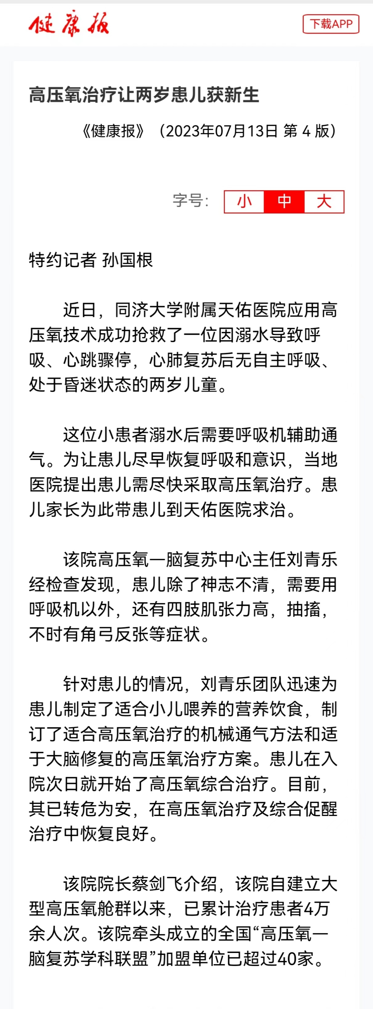 近日,同濟(jì)大學(xué)附屬天佑醫(yī)院應(yīng)用高壓氧技術(shù)成功搶救了一位因溺水導(dǎo)致呼吸、心跳驟停,心肺復(fù)蘇后無(wú)自主呼吸、處于昏迷狀態(tài)的兩歲兒童。 http://jkbshare.183read.cc/article/4963832/5.html