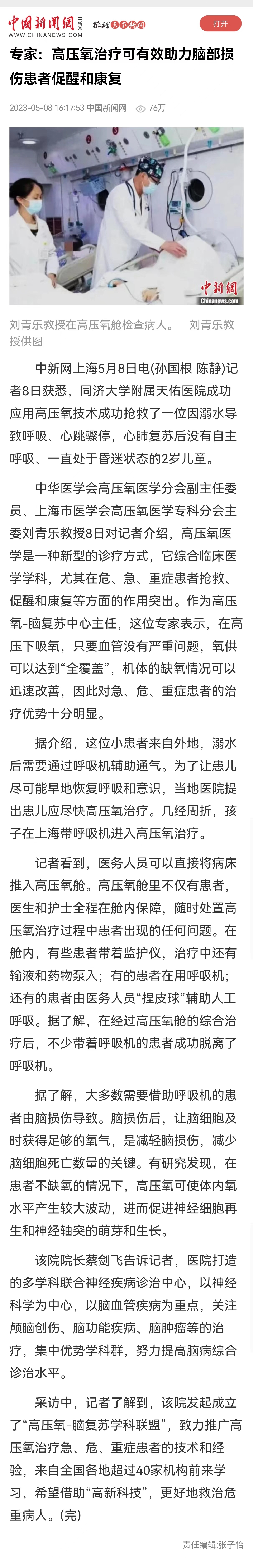中新網(wǎng)上海5月8日電(孫國(guó)根 陳靜)記者8日獲悉,同濟(jì)大學(xué)附屬天佑醫(yī)院成功應(yīng)用高壓氧技術(shù)成功搶救了一位因溺水導(dǎo)致呼吸、心跳驟停,心肺復(fù)蘇后沒(méi)有自主呼吸、一直處于昏迷狀態(tài)的2歲兒童。