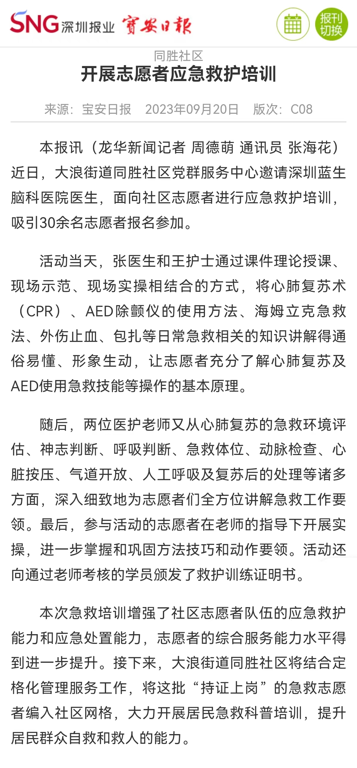 寶安日?qǐng)?bào):深圳藍(lán)生腦科醫(yī)院走進(jìn)社區(qū)開展志愿者應(yīng)急救護(hù)培訓(xùn)