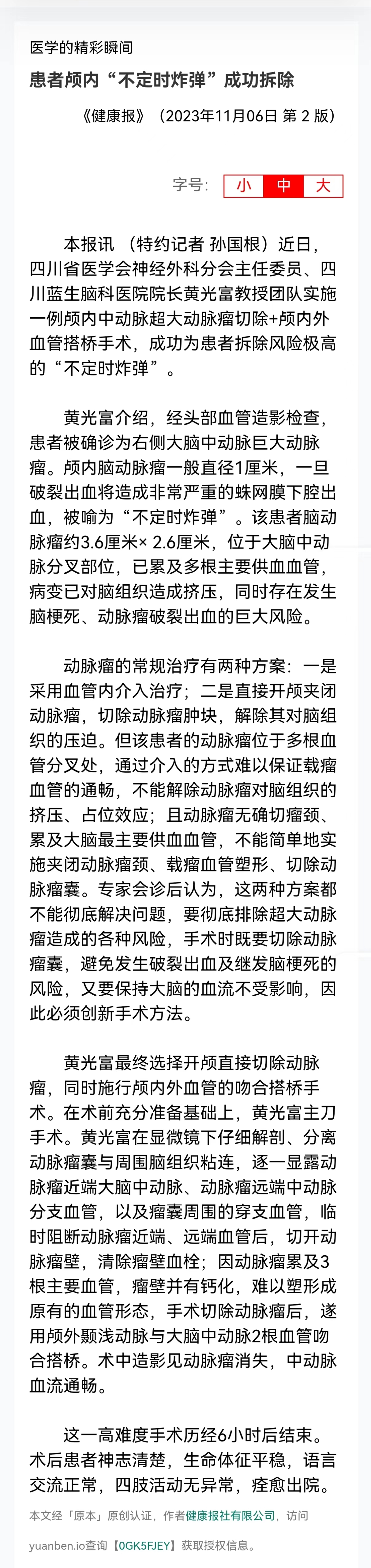 本報訊 (特約記者 孫國根)近日,四川省醫(yī)學會神經(jīng)外科分會主任委員、四川藍生腦科醫(yī)院院長黃光富教授團隊實施一例顱內(nèi)中動脈超大動脈瘤切除+顱內(nèi)外血管搭橋手術(shù),成功為患者拆除風險極高的“不定時炸彈”。