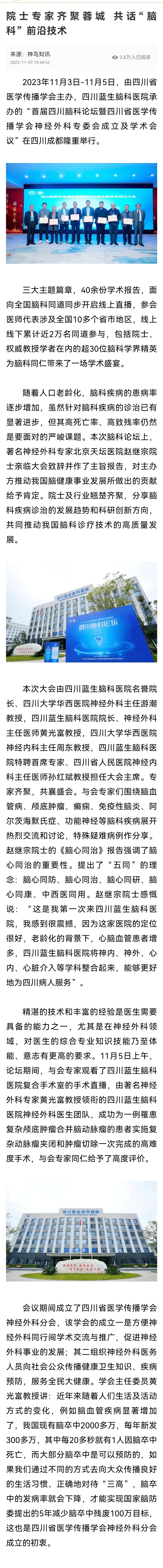 近日,由四川省醫(yī)學傳播學會主辦、四川藍生腦科醫(yī)院承辦的“首屆四川腦科論壇暨四川省醫(yī)學傳播學會神經(jīng)外科專委會成立及學術(shù)會議”在成都舉行。與會專家們圍繞腦血管病、顱底腫瘤功能神經(jīng)等腦科疾病展開了交流和討論,對特殊疑難病例作了分享。