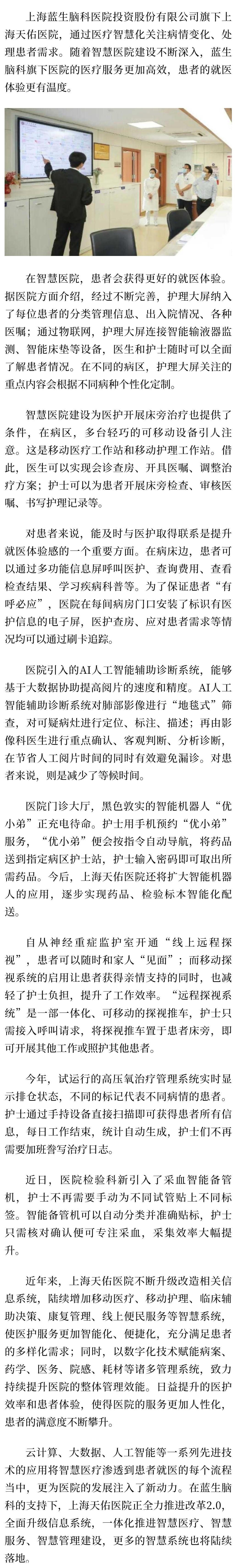 上海藍(lán)生腦科醫(yī)院投資股份有限公司旗下上海天佑醫(yī)院,通過醫(yī)療智慧化關(guān)注病情變化、處理患者需求。隨著智慧醫(yī)院建設(shè)不斷深入,藍(lán)生腦科旗下醫(yī)院的醫(yī)療服務(wù)更加高效,患者的就醫(yī)體驗(yàn)更有溫度。