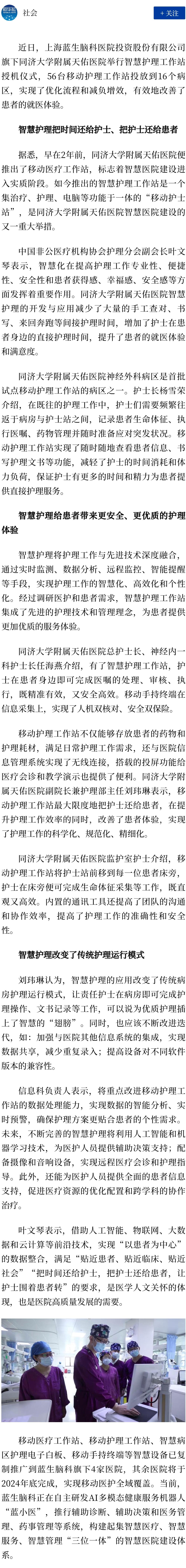 近日,上海藍(lán)生腦科醫(yī)院投資股份有限公司旗下同濟(jì)大學(xué)附屬天佑醫(yī)院舉行智慧護(hù)理工作站授機(jī)儀式,56臺(tái)移動(dòng)護(hù)理工作站投放到16個(gè)病區(qū),實(shí)現(xiàn)了優(yōu)化流程和減負(fù)增效,有效地改善了患者的就醫(yī)體驗(yàn)。