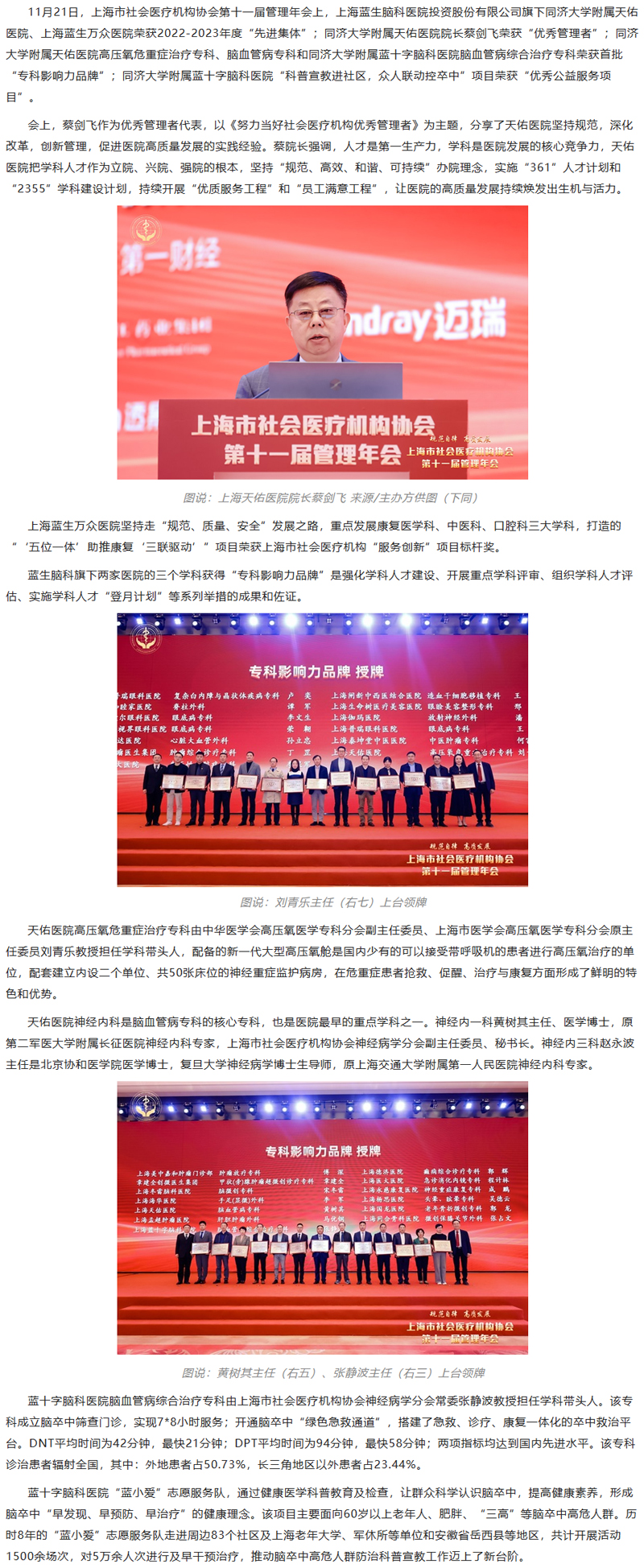 11月21日,上海市社會(huì)醫(yī)療機(jī)構(gòu)協(xié)會(huì)第十一屆管理年會(huì)上,上海藍(lán)生腦科醫(yī)院投資股份有限公司旗下同濟(jì)大學(xué)附屬天佑醫(yī)院、上海藍(lán)生萬(wàn)眾醫(yī)院榮獲2022-2023年度“先進(jìn)集體”;同濟(jì)大學(xué)附屬天佑醫(yī)院院長(zhǎng)蔡劍飛榮獲“優(yōu)秀管理者”;同濟(jì)大學(xué)附屬天佑醫(yī)院高壓氧危重癥治療???、腦血管病??坪屯瑵?jì)大學(xué)附屬藍(lán)十字腦科醫(yī)院腦血管病綜合治療??茦s獲首批“專科影響力品牌”;同濟(jì)大學(xué)附屬藍(lán)十字腦科醫(yī)院“科普宣教進(jìn)社區(qū),眾人聯(lián)動(dòng)控卒中”項(xiàng)目榮獲“優(yōu)秀公益服務(wù)項(xiàng)目”。