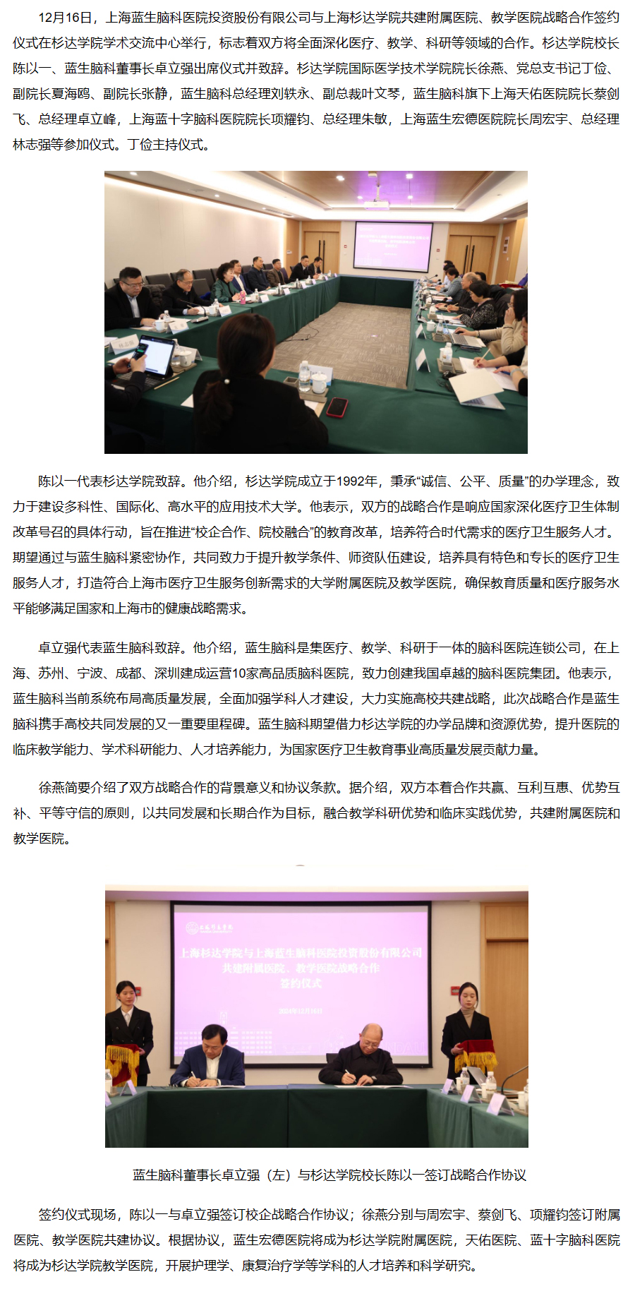 12月16日,上海藍(lán)生腦科醫(yī)院投資股份有限公司與上海杉達(dá)學(xué)院共建附屬醫(yī)院、教學(xué)醫(yī)院戰(zhàn)略合作簽約儀式在杉達(dá)學(xué)院學(xué)術(shù)交流中心舉行,標(biāo)志著雙方將全面深化醫(yī)療、教學(xué)、科研等領(lǐng)域的合作。杉達(dá)學(xué)院校長(zhǎng)陳以一、藍(lán)生腦科董事長(zhǎng)卓立強(qiáng)出席儀式并致辭。