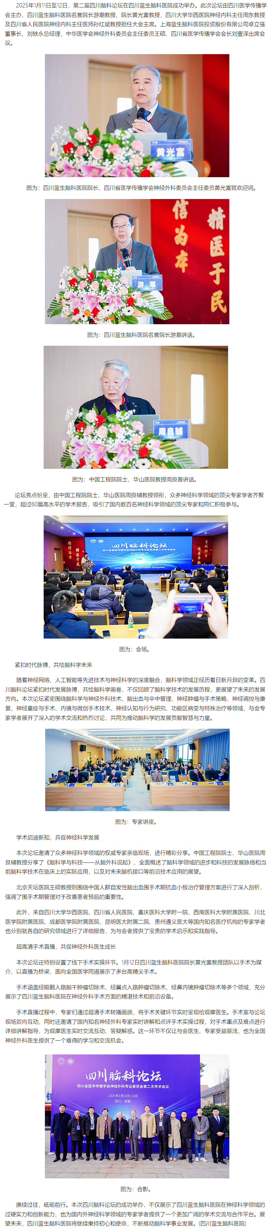 2025年1月11日至12日,第二屆四川腦科論壇在四川藍(lán)生腦科醫(yī)院成功舉辦。此次論壇由四川醫(yī)學(xué)傳播學(xué)會主辦,四川藍(lán)生腦科醫(yī)院名譽院長游潮教授、院長黃光富教授,四川大學(xué)華西醫(yī)院神經(jīng)內(nèi)科主任周東教授及四川省人民醫(yī)院神經(jīng)內(nèi)科主任醫(yī)師孫紅斌教授擔(dān)任大會主席。上海藍(lán)生腦科醫(yī)院投資股份有限公司卓立強董事長、劉軼永總經(jīng)理,中華醫(yī)學(xué)會神經(jīng)外科委員會主任委員王碩、四川省醫(yī)學(xué)傳播學(xué)會會長劉壹澤出席會議。