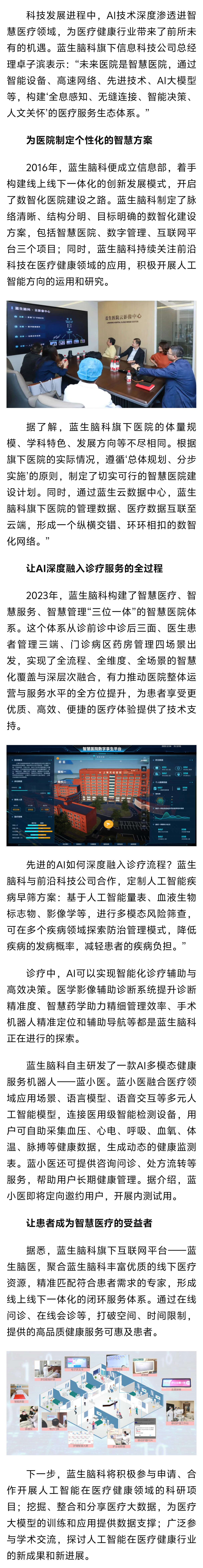 科技發(fā)展進程中,AI技術(shù)深度滲透進智慧醫(yī)療領(lǐng)域,為醫(yī)療健康行業(yè)帶來了前所未有的機遇。藍生腦科旗下信息科技公司總經(jīng)理卓子濱表示:“未來醫(yī)院是智慧醫(yī)院,通過智能設(shè)備、高速網(wǎng)絡(luò)、先進技術(shù)、AI大模型等,構(gòu)建‘全息感知、無縫連接、智能決策、人文關(guān)懷’的醫(yī)療服務(wù)生態(tài)體系。”