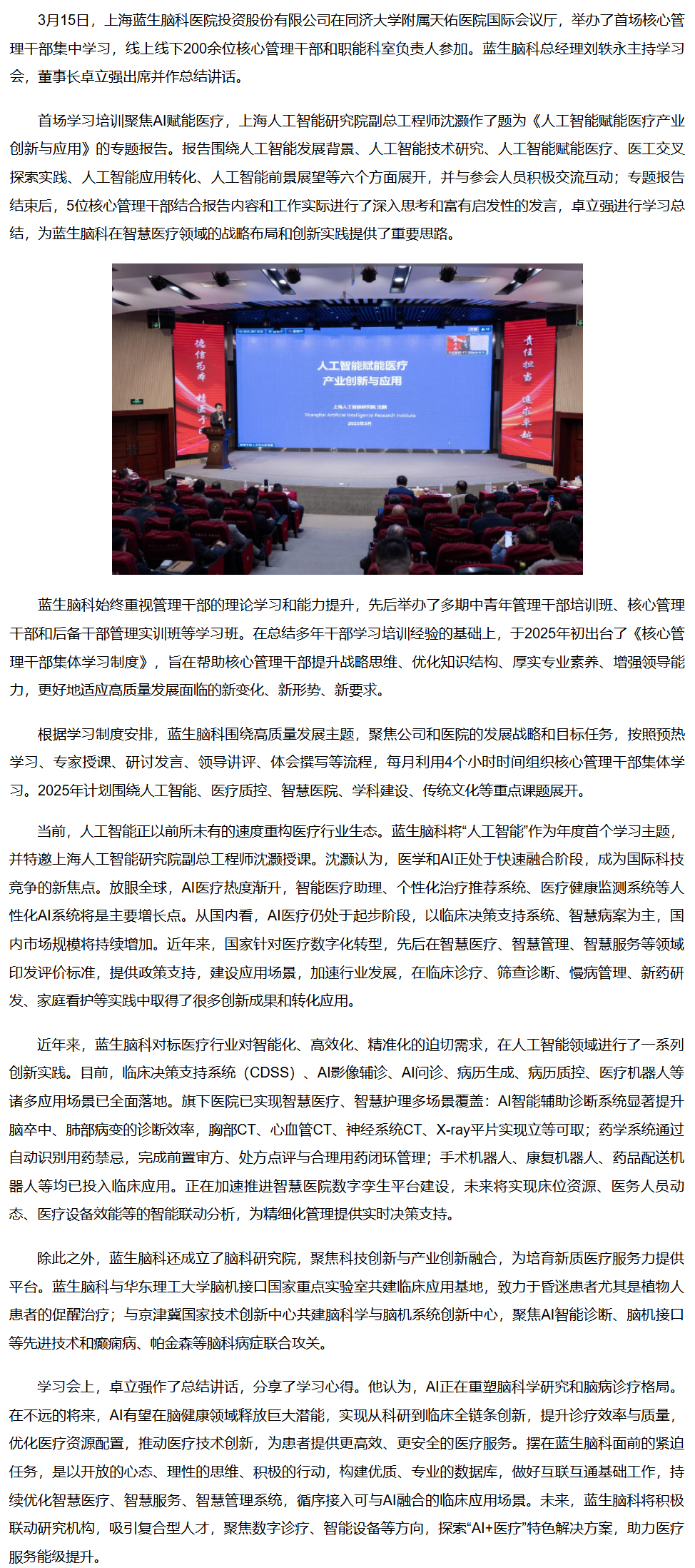 3月15日,上海藍(lán)生腦科醫(yī)院投資股份有限公司在同濟(jì)大學(xué)附屬天佑醫(yī)院國際會議廳,舉辦了首場核心管理干部集中學(xué)習(xí),線上線下200余位核心管理干部和職能科室負(fù)責(zé)人參加。藍(lán)生腦科總經(jīng)理劉軼永主持學(xué)習(xí)會,董事長卓立強(qiáng)出席并作總結(jié)講話。