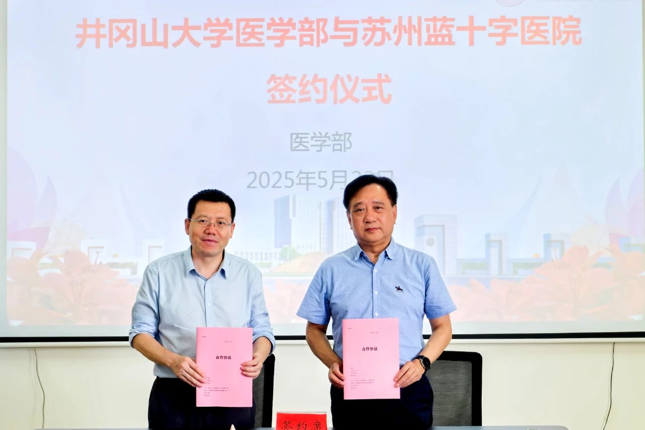 △ 井岡山大學(xué)醫(yī)學(xué)部黨工委副書記康永平(左)與徐必生院長簽約