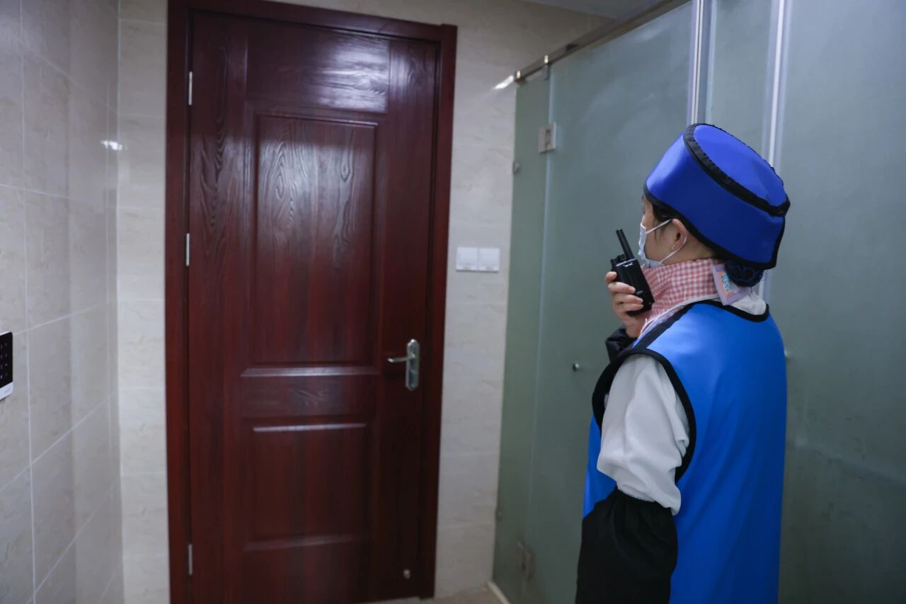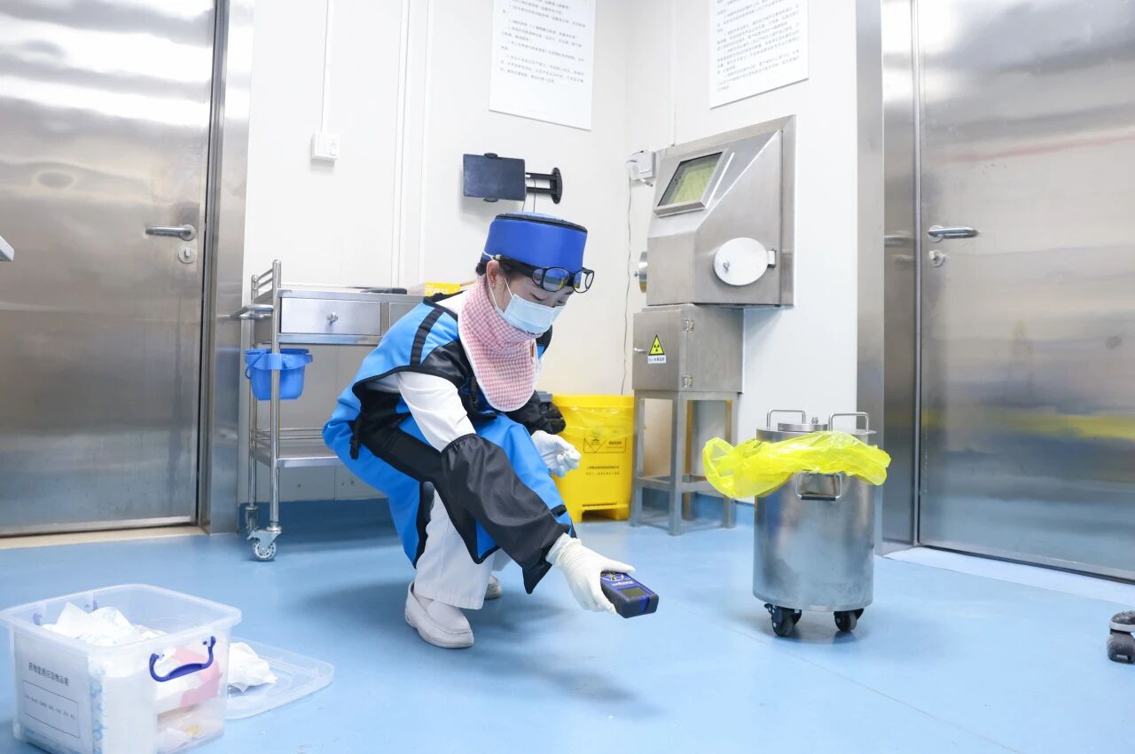 15點15分,普陀區(qū)生態(tài)環(huán)境局、普陀區(qū)疾控中心(區(qū)衛(wèi)監(jiān)所)、普陀區(qū)公安分局治安支隊人員同時到場。生態(tài)環(huán)境局應(yīng)急處置人員穿戴好防護(hù)裝備,手持輻射監(jiān)測儀,從PET-CT室大門口向內(nèi)進(jìn)行輻射監(jiān)測。