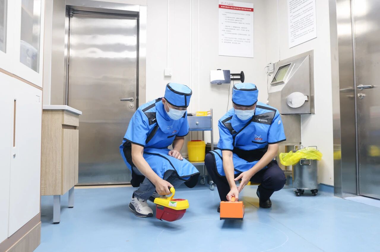 突發(fā)意外,非同小可。當(dāng)事人立即啟動應(yīng)急預(yù)案,一場演練也就此展開。陳波護(hù)師作為現(xiàn)場主要當(dāng)事人,迅速穿戴防化服后用具有吸附性的紙巾和抹布對灑落的氟-18進(jìn)行清理,并將沾有鍀-99的清理雜物放入指定放射性廢物儲存點,隨后迅速離開現(xiàn)場。