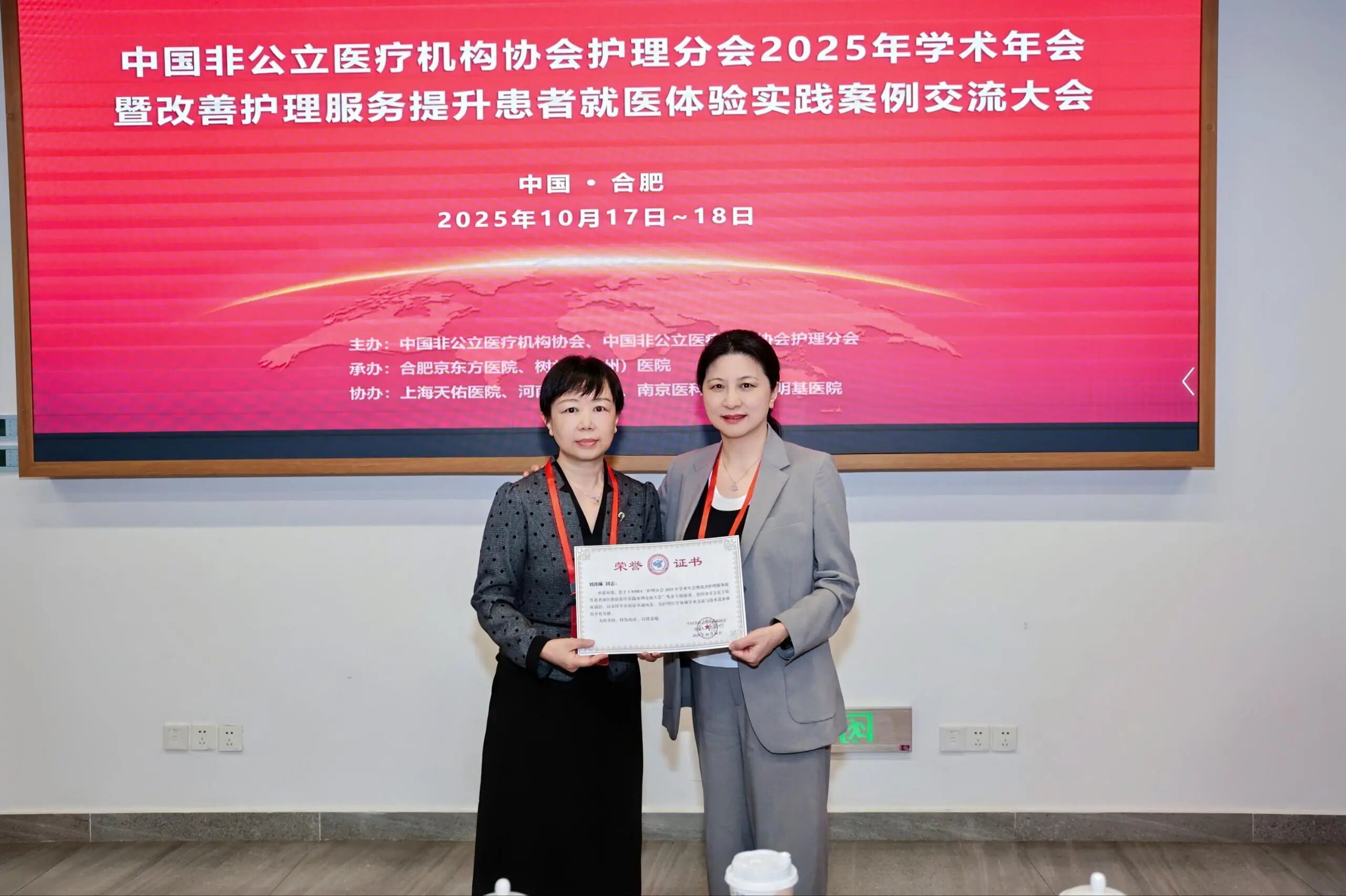 10月17-18日,中國非公立醫(yī)療機構(gòu)協(xié)會護理分會2025年學(xué)術(shù)年會暨改善護理服務(wù)提升患者就醫(yī)體驗最佳實踐案例交流大會在合肥召開。上海天佑醫(yī)院作為大會的協(xié)辦單位之一,負(fù)責(zé)運營與績效管理分會場的籌備工作。會議當(dāng)天,副院長、護理部主任劉瑋琳帶領(lǐng)覃健鳳、任海燕、張穎三位總護士長參會。