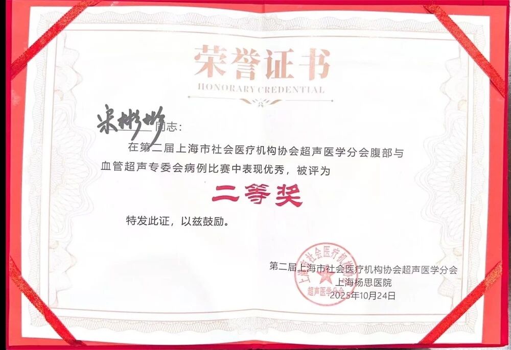 上海天佑醫(yī)院超聲科高度重視青年醫(yī)師培養(yǎng)與醫(yī)療質(zhì)量控制,通過系統(tǒng)的科內(nèi)業(yè)務(wù)學(xué)習(xí)、院內(nèi)外質(zhì)控評比與技能競賽等多元途徑,持續(xù)夯實(shí)專業(yè)基礎(chǔ)、沉淀實(shí)踐能力??剖覍①愡^程轉(zhuǎn)化為重要的學(xué)習(xí)契機(jī),鼓勵(lì)青年醫(yī)師在持續(xù)學(xué)習(xí)、交流反思中提升專業(yè)素養(yǎng)。早在2024年,主治醫(yī)師姜玲在上海市社會醫(yī)療機(jī)構(gòu)超聲醫(yī)學(xué)分會心臟疑難病例大賽中榮獲三等獎(jiǎng),石英華主治醫(yī)師在《腹部疾病超聲適宜技術(shù)規(guī)范化培訓(xùn)》[滬]暨上海市社會醫(yī)療機(jī)構(gòu)協(xié)會超聲醫(yī)學(xué)分會疑難病例大賽中榮獲三等獎(jiǎng)。