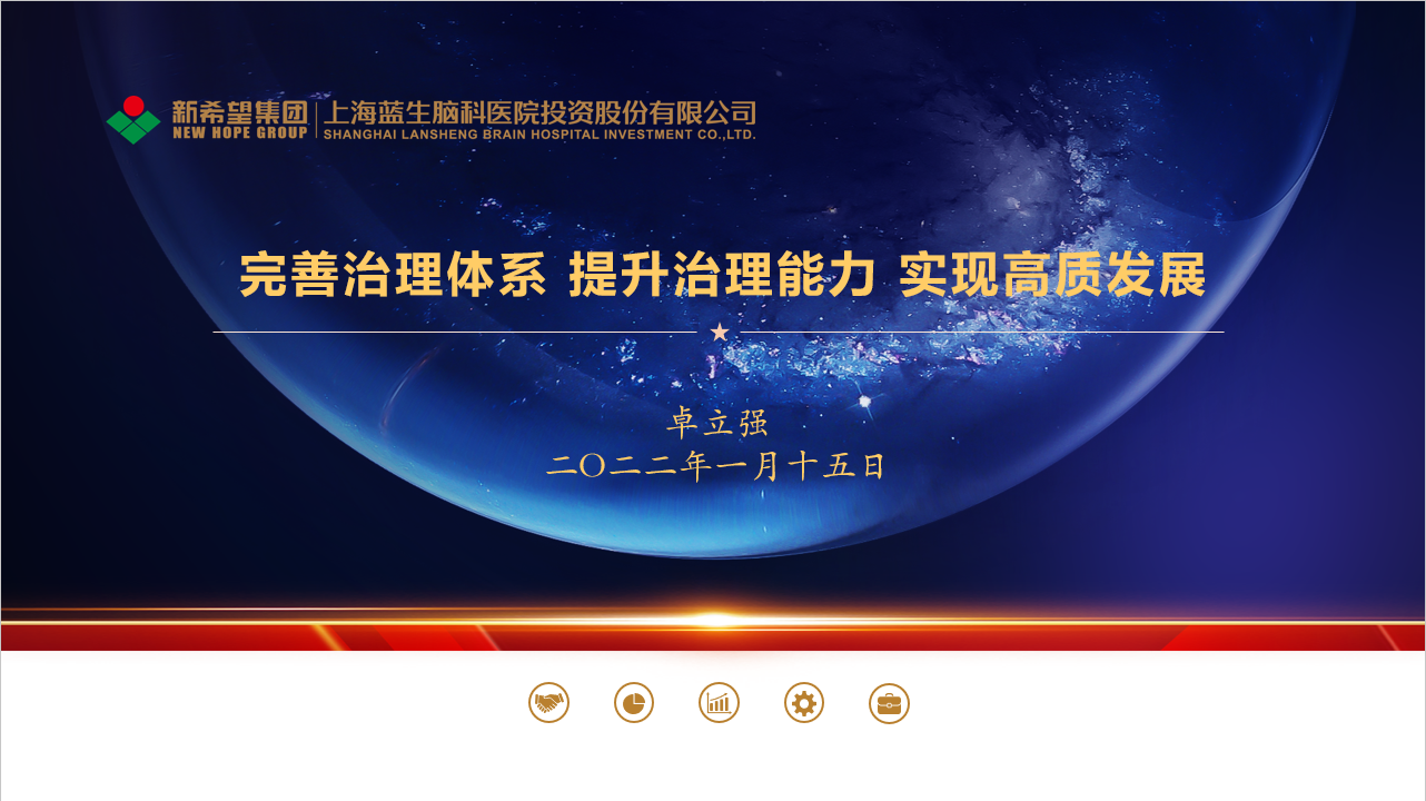 上午的大會為醫(yī)院和子公司匯報環(huán)節(jié)。公司副總裁兼同濟(jì)大學(xué)附屬天佑醫(yī)院院長蔡劍飛、公司副總裁兼同濟(jì)大學(xué)附屬腦科醫(yī)院院長項(xiàng)耀鈞、上海藍(lán)生萬眾醫(yī)院院長韓建新、上海藍(lán)生宏德醫(yī)院院長周宏宇、慈溪藍(lán)十字腦科醫(yī)院院長杭鶴云就2021年工作完成情況、成績亮點(diǎn)、檢討反省和2022年計劃安排作匯報。