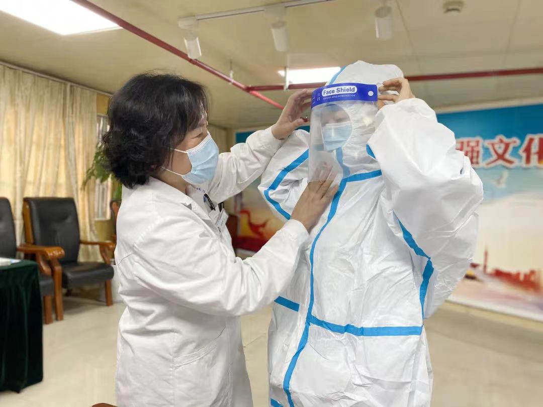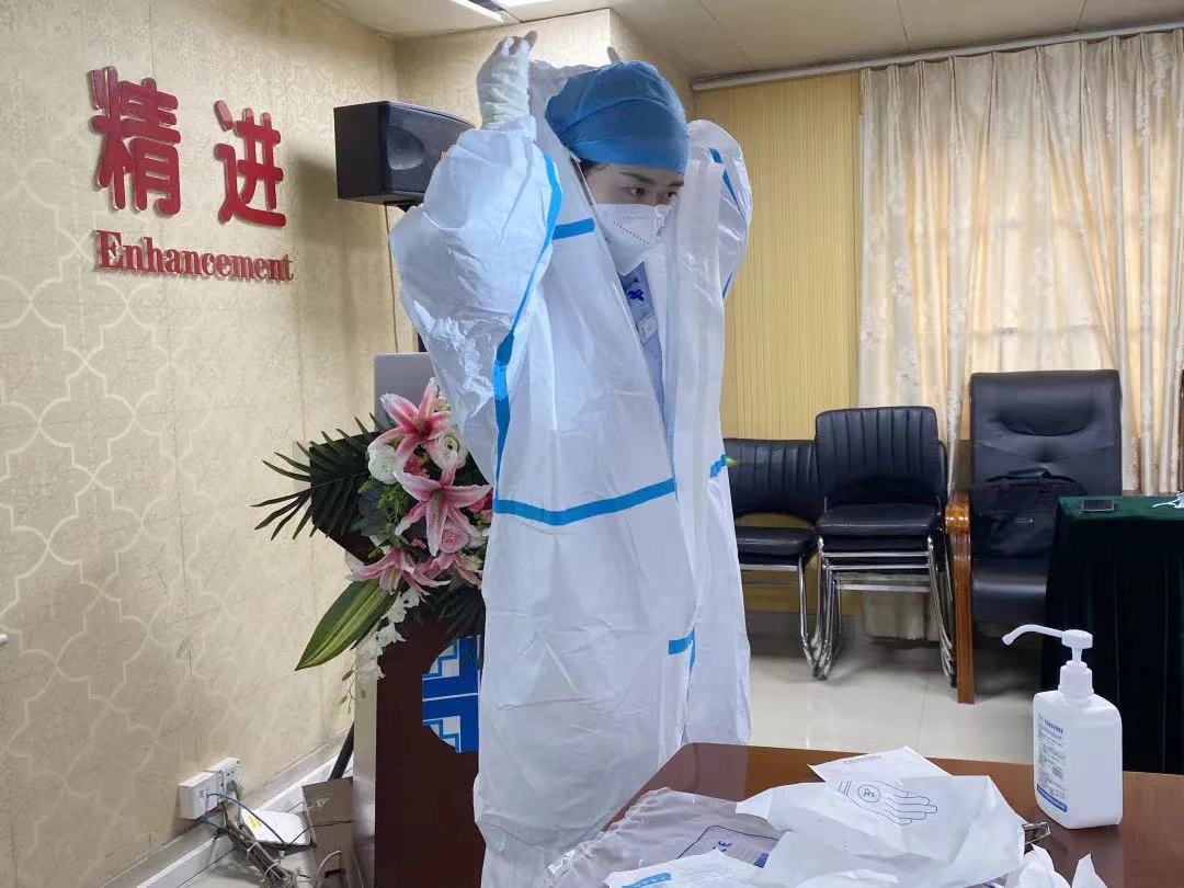 四病區(qū)護(hù)士長(zhǎng)于如如現(xiàn)場(chǎng)指導(dǎo)示范穿戴防護(hù)服和消毒隔離的正確操作,通過結(jié)合視頻課件和實(shí)操培訓(xùn),隊(duì)員們逐一通過考核并完成采樣崗前防控培訓(xùn)。
