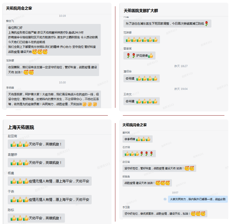 全院員工在了解到醫(yī)療隊快速奔赴一線后,紛紛通過微信留言,為戰(zhàn)友們加油鼓勁。很多員工表示隨時準(zhǔn)備著,只要有需要,隨時出征,為普陀、為上??挂咦鞒鰬?yīng)有的貢獻(xiàn)。