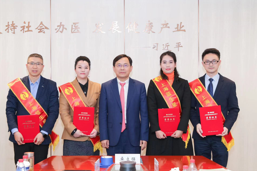 頒獎(jiǎng)環(huán)節(jié),卓立強(qiáng)董事長(zhǎng)為“藍(lán)生杰出星光獎(jiǎng)”和“藍(lán)生星光獎(jiǎng)”代表頒發(fā)獎(jiǎng)杯證書(shū)、合影留念。卓立強(qiáng)董事長(zhǎng)向獲獎(jiǎng)人員表示祝賀,用“感動(dòng)、感激、感恩”向“以生命守護(hù)生命、用擔(dān)當(dāng)承載使命、以摯愛(ài)守護(hù)蒼生”的員工尤其是醫(yī)護(hù)人員表示感謝。