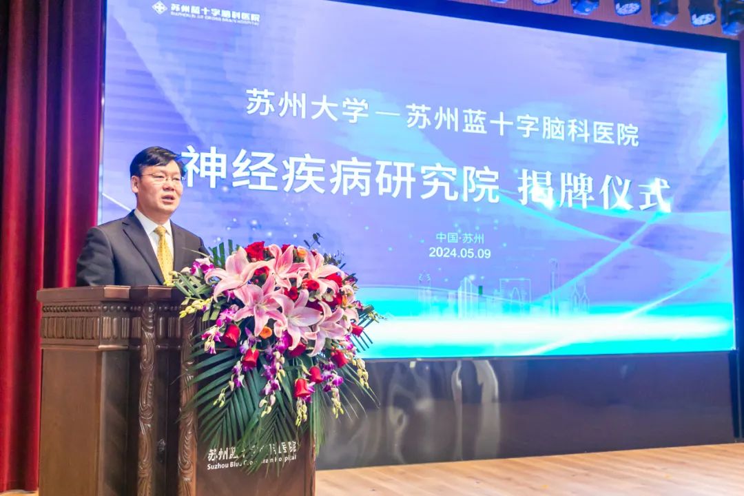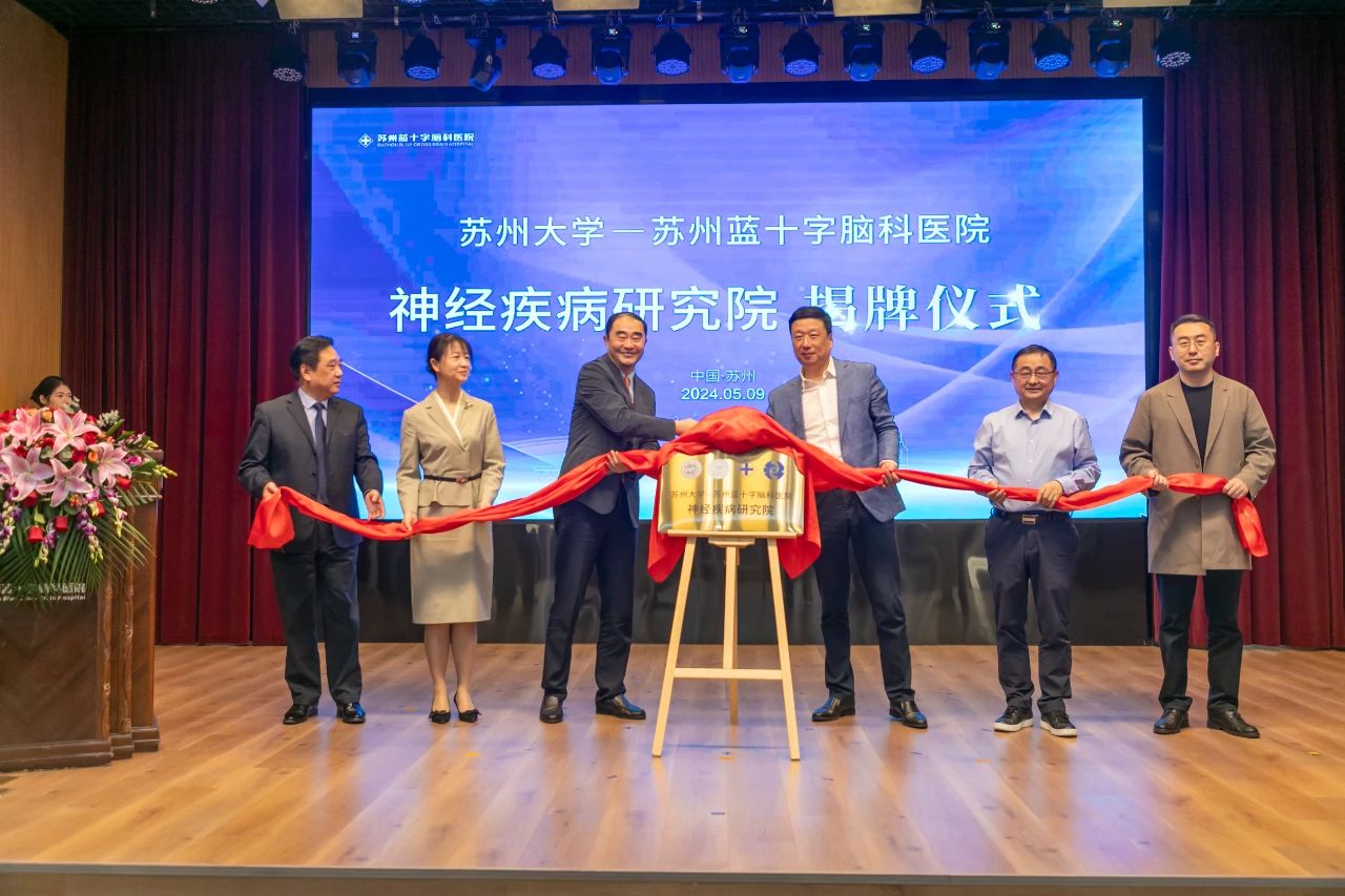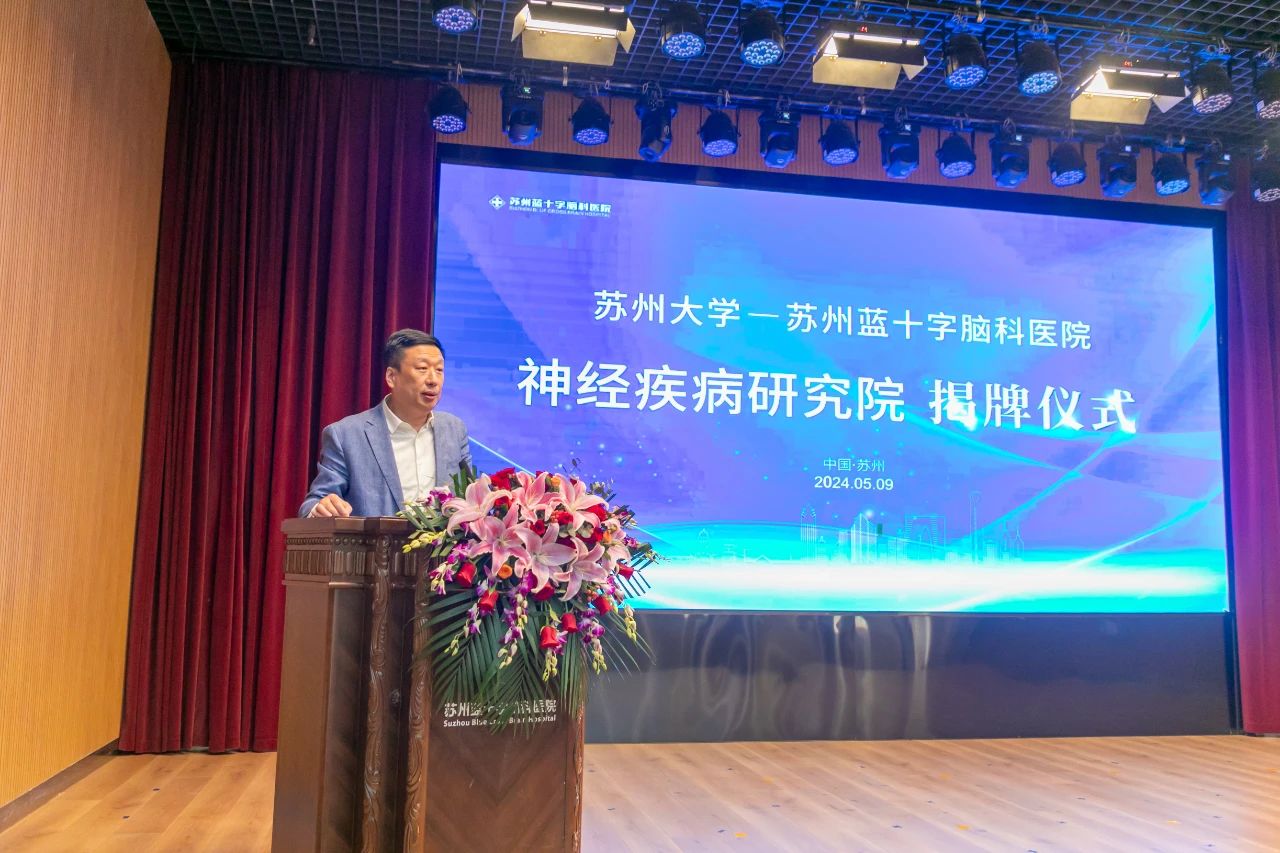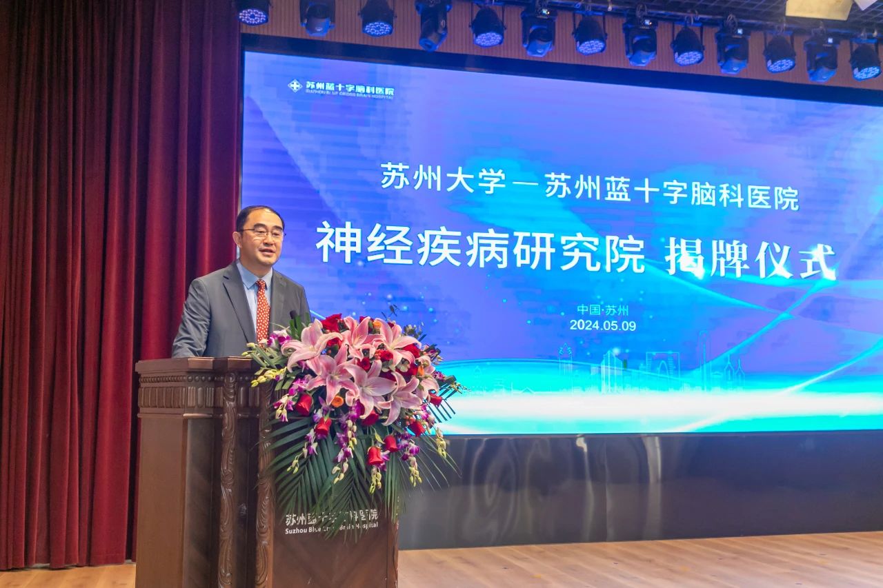2024年5月9日上午,惠風(fēng)和暢,蓓蕾初放,蘇州大學(xué)-蘇州藍(lán)十字腦科醫(yī)院神經(jīng)疾病研究院揭牌儀式于蘇州藍(lán)十字腦科醫(yī)院舉行。蘇州大學(xué)科技黨委書(shū)記徐小樂(lè)、蘇州市相城區(qū)衛(wèi)健委主任孫偉為、蘇州大學(xué)神經(jīng)科學(xué)研究所副所長(zhǎng)劉耀波、公司總經(jīng)理劉軼永、蘇州藍(lán)十字腦科醫(yī)院院長(zhǎng)徐必生出席儀式并致辭。