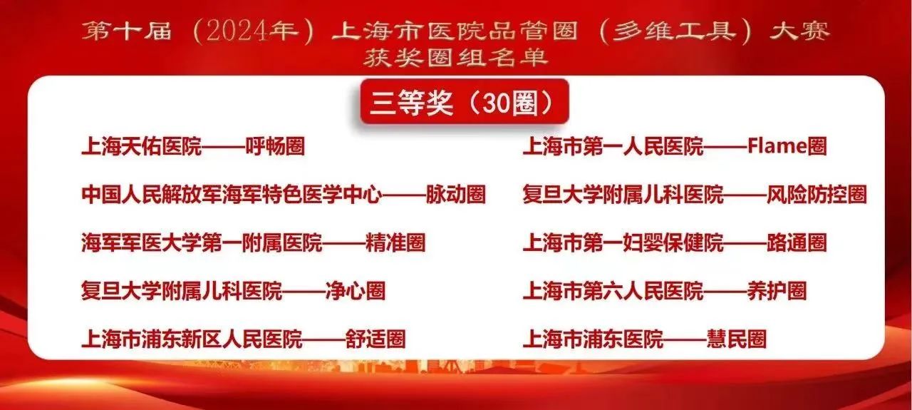 上海天佑醫(yī)院運用品管圈工具的這些年,切實有效地幫助臨床一線醫(yī)務人員掌握了PDCA的循環(huán)手法,讓他們能在工作中及時發(fā)現(xiàn)問題、科學分析原因、高效解決問題,醫(yī)院的管理團隊管理能力更強了,醫(yī)療質(zhì)量、服務能級等各方面都得到了顯著提升。在2024第三屆全國醫(yī)院醫(yī)療服務質(zhì)量管理(PDCA)案例交流大會·醫(yī)療服務質(zhì)量管理(PDCA)案例總決賽中,榮獲二等獎2項、三等獎2項的優(yōu)異成績。未來,公司旗下醫(yī)院將持續(xù)優(yōu)化、深化品管圈活動,把品管圈活動與服務能力相結合,推進醫(yī)療質(zhì)量和安全管理的科學化、規(guī)范化,助推醫(yī)院高質(zhì)量發(fā)展。