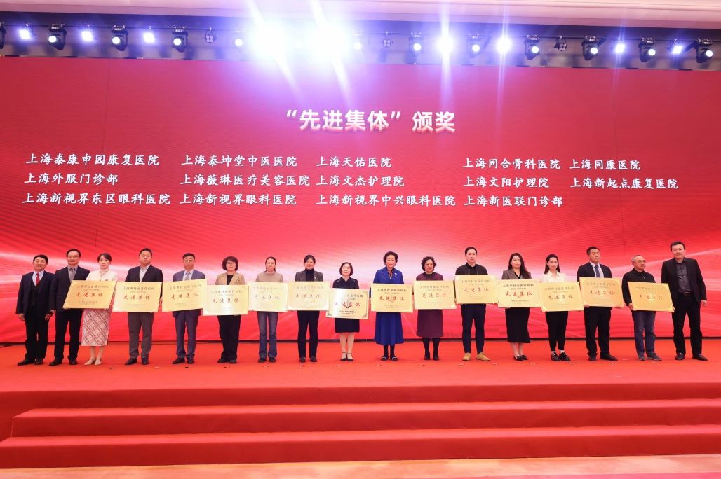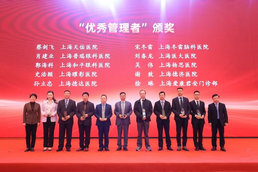 上海天佑醫(yī)院蔡劍飛院長(左五)代表醫(yī)院上臺領獎