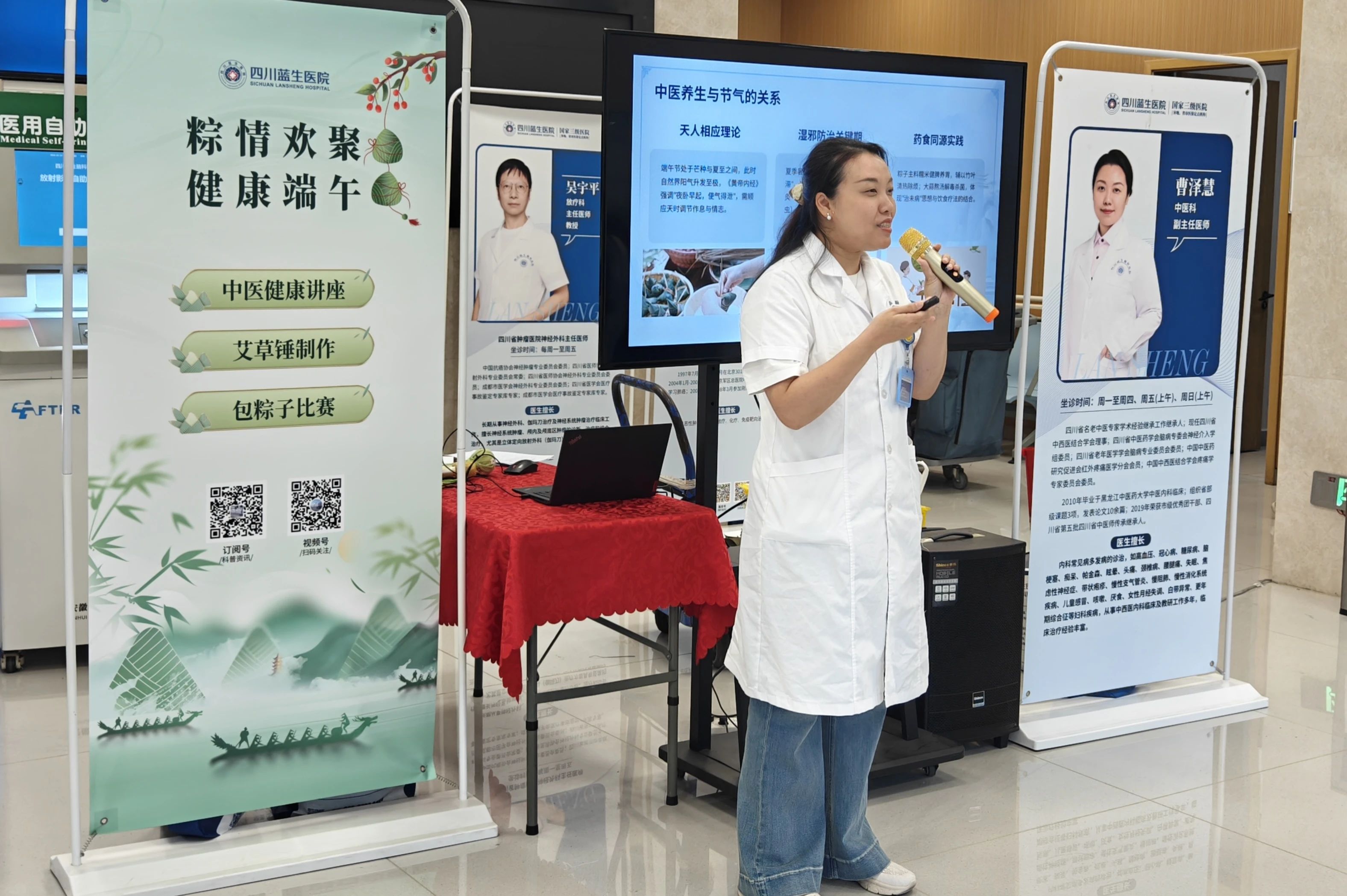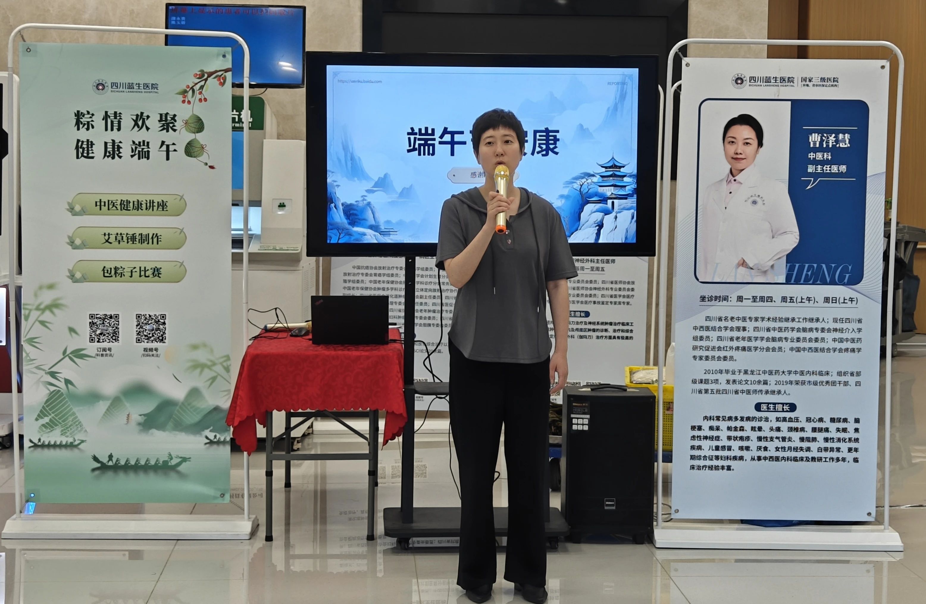 活動開場,中醫(yī)科曹澤慧副主任帶來一場精彩的中醫(yī)健康講座。她結(jié)合端午傳統(tǒng)習俗,深入講解夏季養(yǎng)生要點,涵蓋飲食調(diào)理、起居作息、運動鍛煉等方面。曹主任強調(diào),端午時節(jié)氣溫高、濕度大,易引發(fā)身體不適,因此要注意飲食清淡,多吃蔬菜水果,避免食用過多油膩、辛辣食物;同時保證充足的睡眠,適當進行運動,以增強體質(zhì),預防疾病。講解生動有趣,贏得現(xiàn)場觀眾的陣陣掌聲。