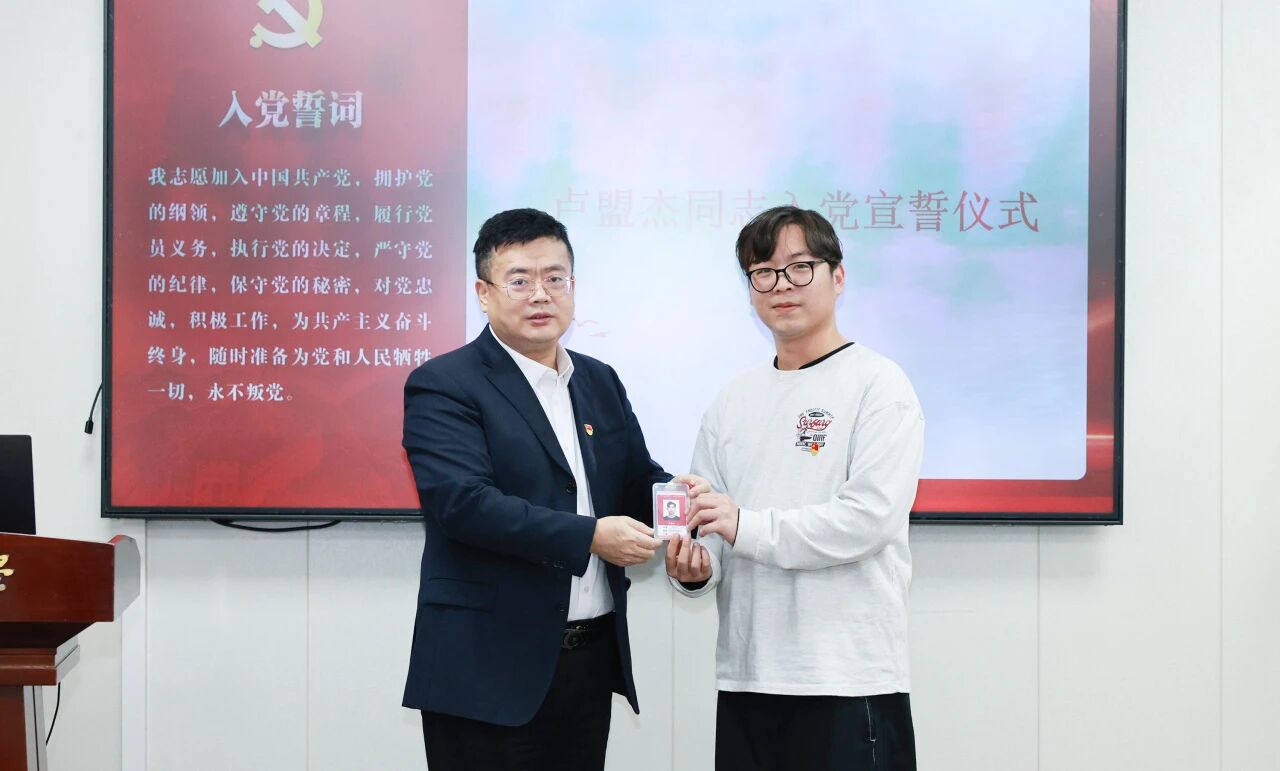 儀式伊始,趙宇蘭副書記鄭重宣讀了同意接收盧盟杰同志為預(yù)備黨員的審議決定。朱敏書記代表黨支部向盧盟杰同志表示誠摯祝賀,并宣布宣誓儀式正式開始。