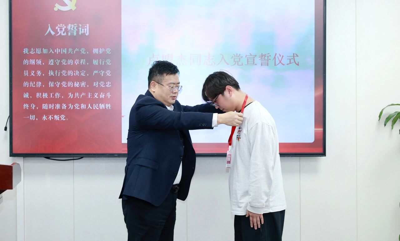 隨后,朱敏書記為盧盟杰同志佩戴黨員工牌,并勉勵(lì)其要持續(xù)深耕專業(yè)知識(shí),勤學(xué)深思黨史黨章,時(shí)刻以黨員標(biāo)準(zhǔn)嚴(yán)格要求自己,切實(shí)擔(dān)當(dāng)起黨員的身份與責(zé)任。