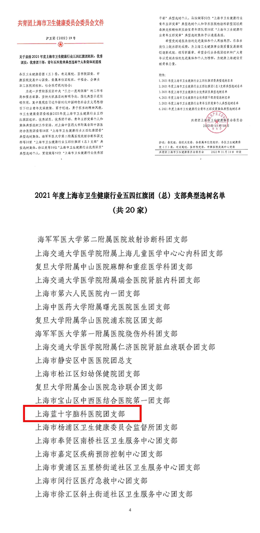 11月10日,上海市衛(wèi)生健康委團委通報表揚2021年度上海市衛(wèi)生健康行業(yè)五四紅旗團組織、優(yōu)秀團員、優(yōu)秀團干部、青年五四獎章典型選樹個人和集體。上海藍十字腦科醫(yī)院團支部獲評2021年度上海市衛(wèi)生健康行業(yè)五四紅旗團(總)支部典型選樹集體。