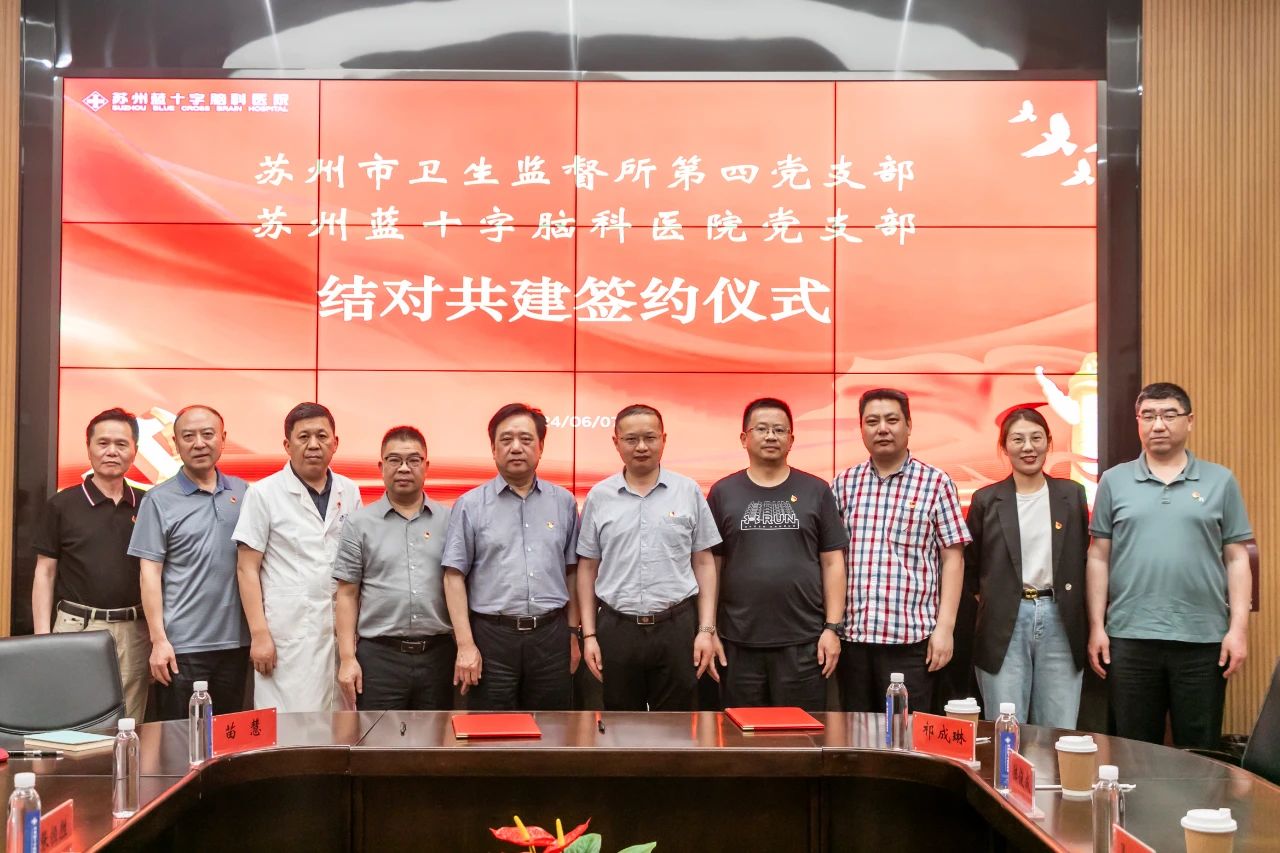 為深入貫徹落實(shí)習(xí)近平總書記關(guān)于黨的建設(shè)重要講話精神和指示要求,將新時(shí)代黨的建設(shè)總要求和新時(shí)代黨的組織路線落到實(shí)處,加強(qiáng)黨組織互融共進(jìn)、優(yōu)勢(shì)互補(bǔ),開創(chuàng)“黨建引領(lǐng)、凝聚共識(shí)、推動(dòng)發(fā)展”的新格局,2024年6月7日,蘇州藍(lán)十字腦科醫(yī)院黨支部與蘇州市衛(wèi)生監(jiān)督所第四黨支部舉行“結(jié)對(duì)共建”簽約揭牌儀式,醫(yī)院黨支部書記徐必生同志及黨員代表,蘇州市衛(wèi)生監(jiān)督所副所長張家兵及成員代表,雙方相關(guān)部門負(fù)責(zé)同志參加簽約儀式。