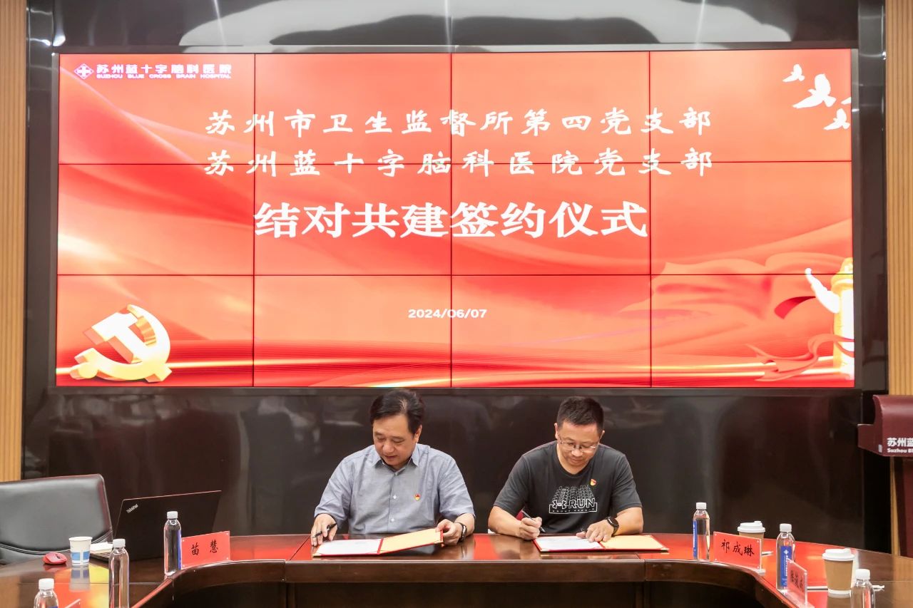 會(huì)上,蘇州藍(lán)十字腦科醫(yī)院黨支部書記徐必生與蘇州市衛(wèi)生監(jiān)督所第四黨支部書記何愷在簽約席共同簽署了《黨建共建協(xié)議書》。